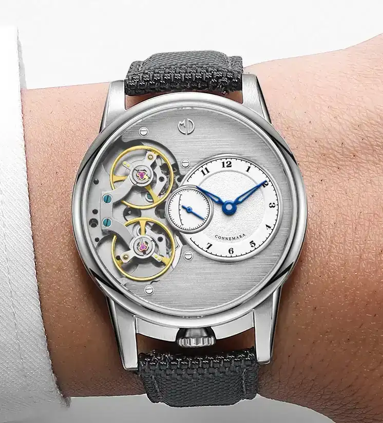 Aquí Martin nos sorprende con otra complicación poco vista que es un dial descentrado a las 3, un doble escape a la izquierda y un small seconds en el centro.