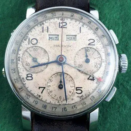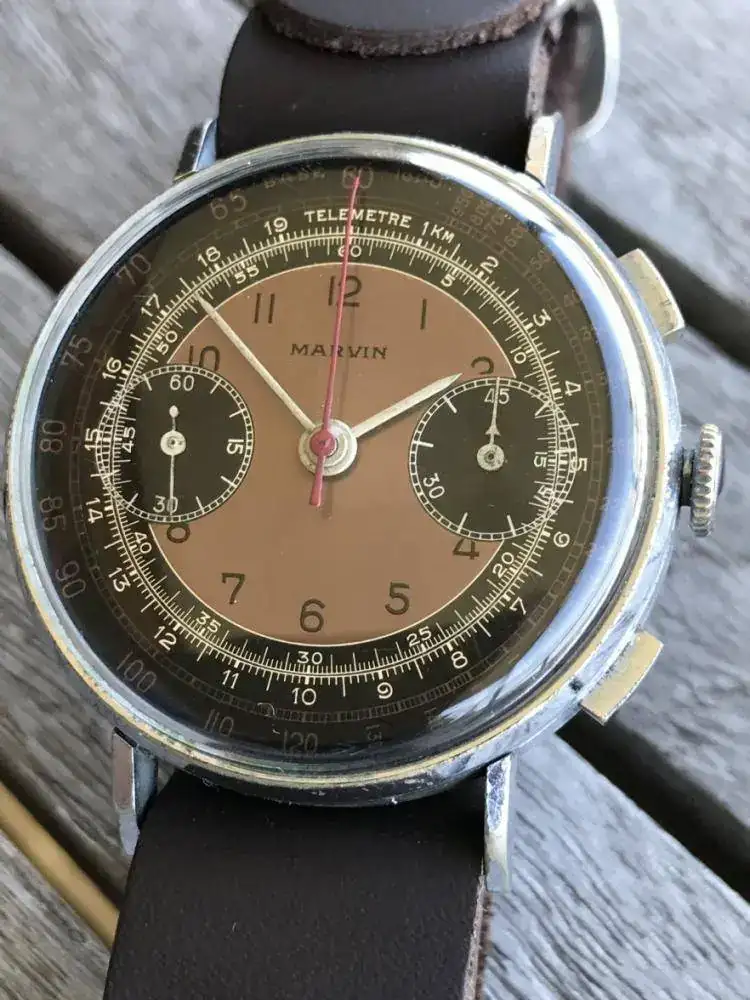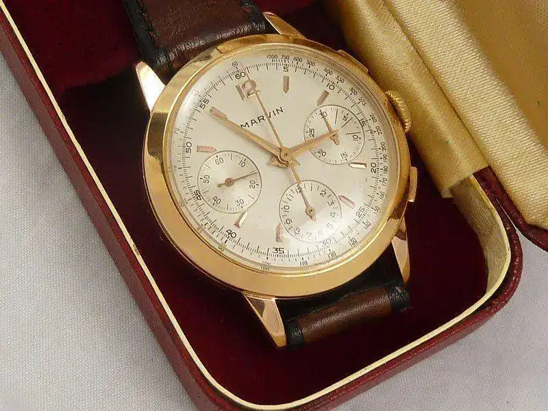 Marvin cronógrafo con un estilo clasico que se remonta a principios de la década de 1940 con un movimiento crono Landerons y hecho para Maserati en 1961 (foto de collectorsstudio.com):