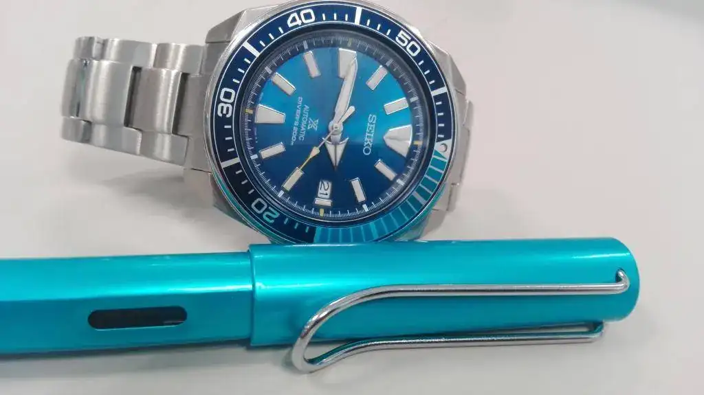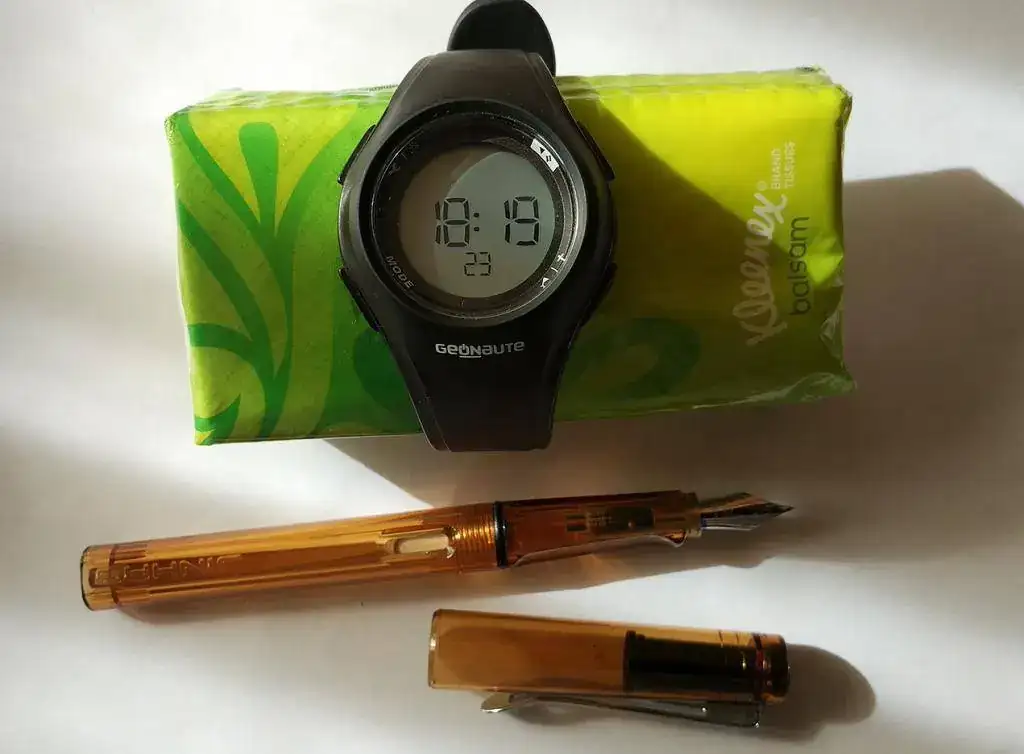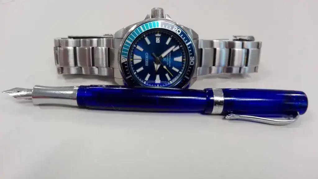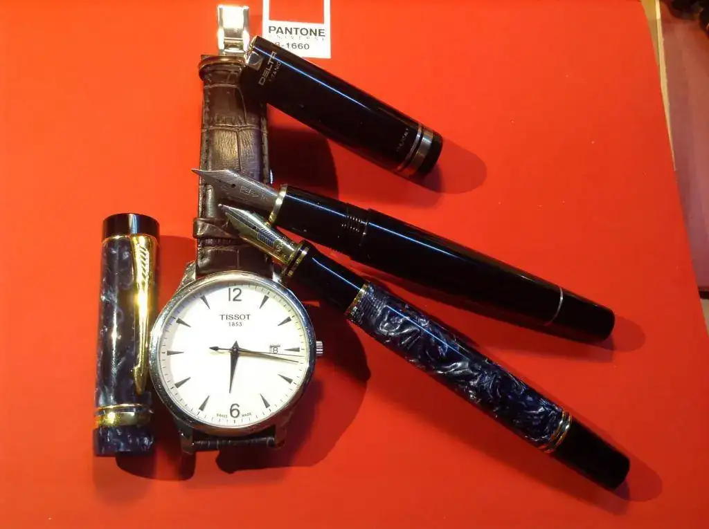 Buena combinación y no se que decirte, mejor es no aficionarse, bueno , no lo tengo yo muy claro, desde luego para la cartera mejor no te aficiones.No soy muy aficionado a los relojes, la verdad. Todos los que uso proceden de regalos y los llevo más por necesidad y cumplido que por otra cosa, porque al llegar a casa es lo primero que me quito. Pero alguna pieza tengo por aquí que a lo mejor se merece salir en una foto. Un Tissot, junto a una Delta Titanio y una Parker Duofold Centennial, las que están en danza esta semana.