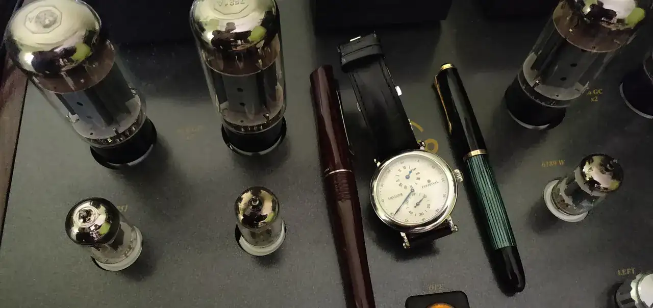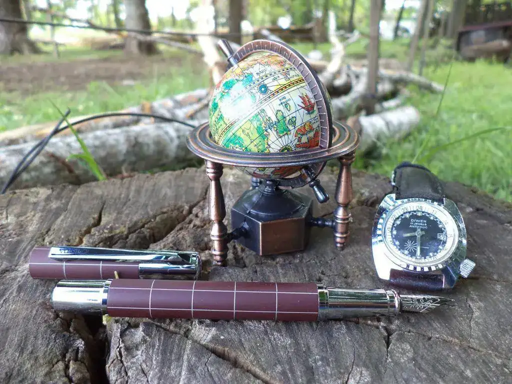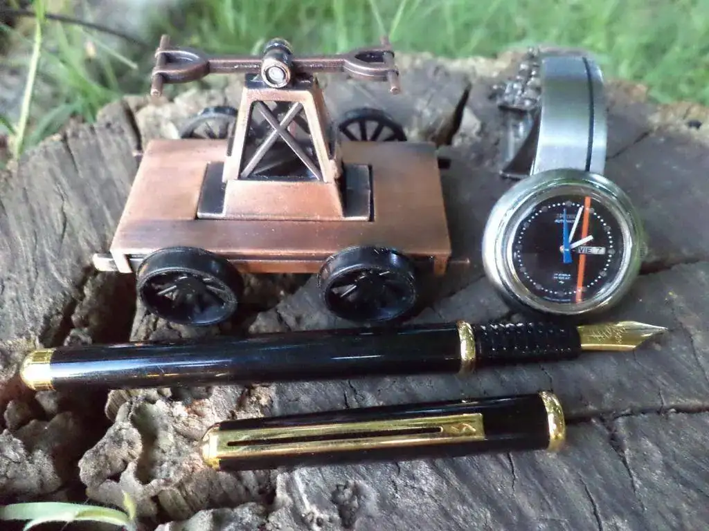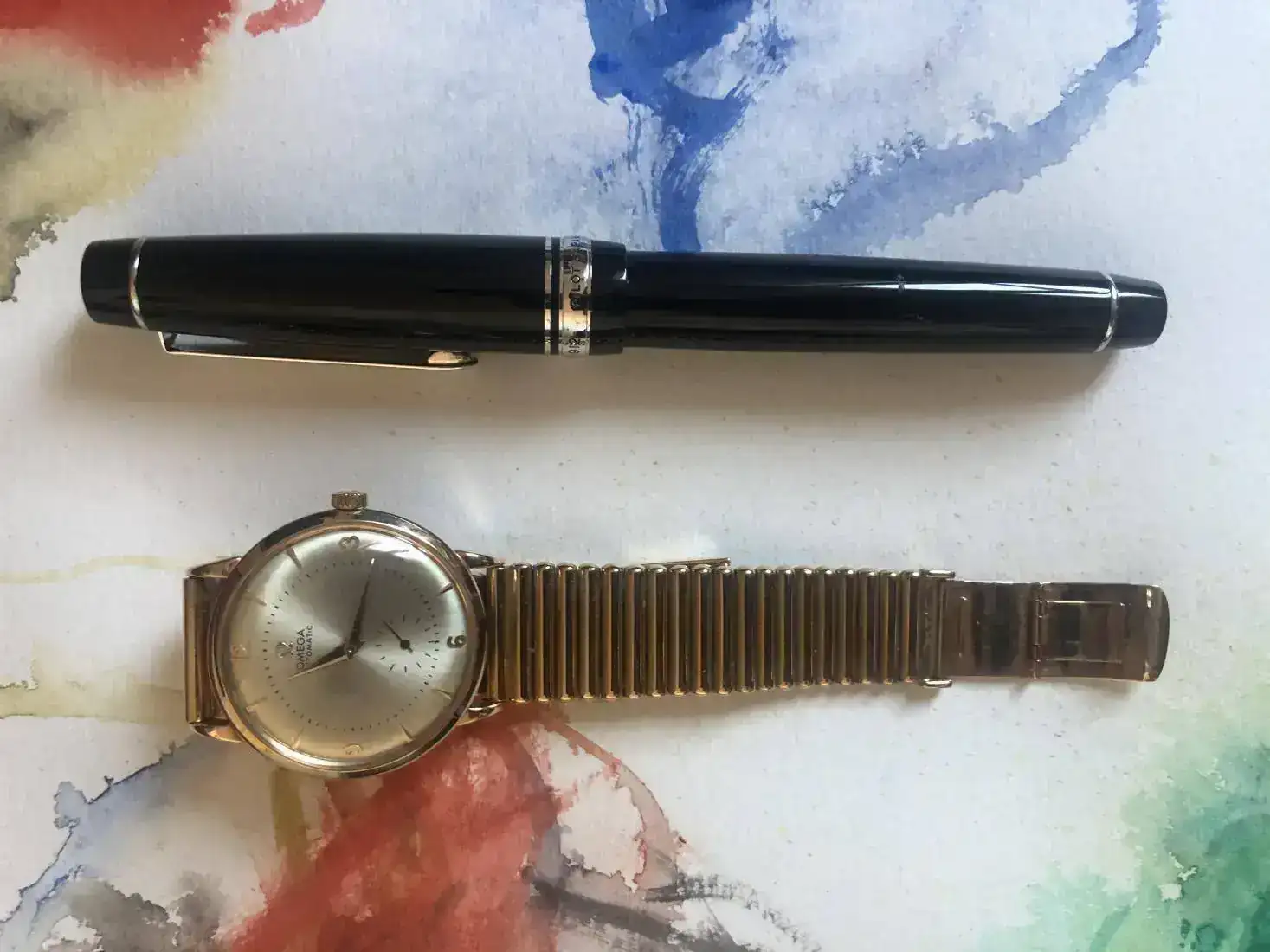 Foto de hace 5 minutos: reloj de bolsillo Marconi y pluma Jinhao.