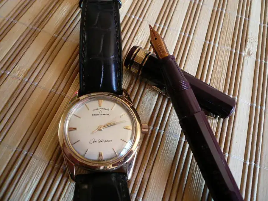 Mientras espero por la Terracota, que viajó a fábrica unos días, la sustituyo para el combo de hoy con una Omas AI de bolsillo, una 555/F, color burdeos, que no va muy mal con mi viejo amigo, un Eterna-Matic Centenaire, reloj sencillo, eficaz, y elegante donde los haya.