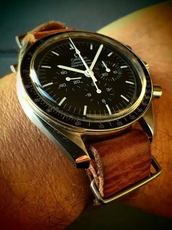 Muchas gracias, amigo. La correa es de la prestigiosa marca Manolo Straps (la he hecho yo). Es verdad que con las NATO de piel corres el riesgo de que el reloj suba mucho. Por eso hay que elegir un retal de piel fina. Incluso puedes martirizarla un poco, con lo que además consigues el aspecto vintage. Creo que el Speedmaster, que no es un reloj muy alto, las tolera. Un saludo!