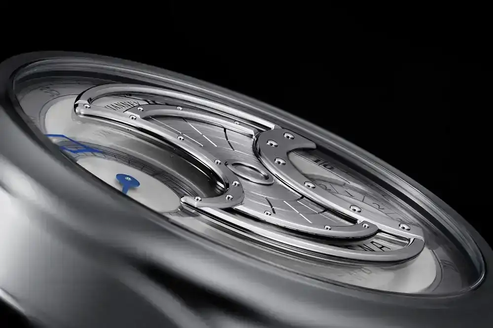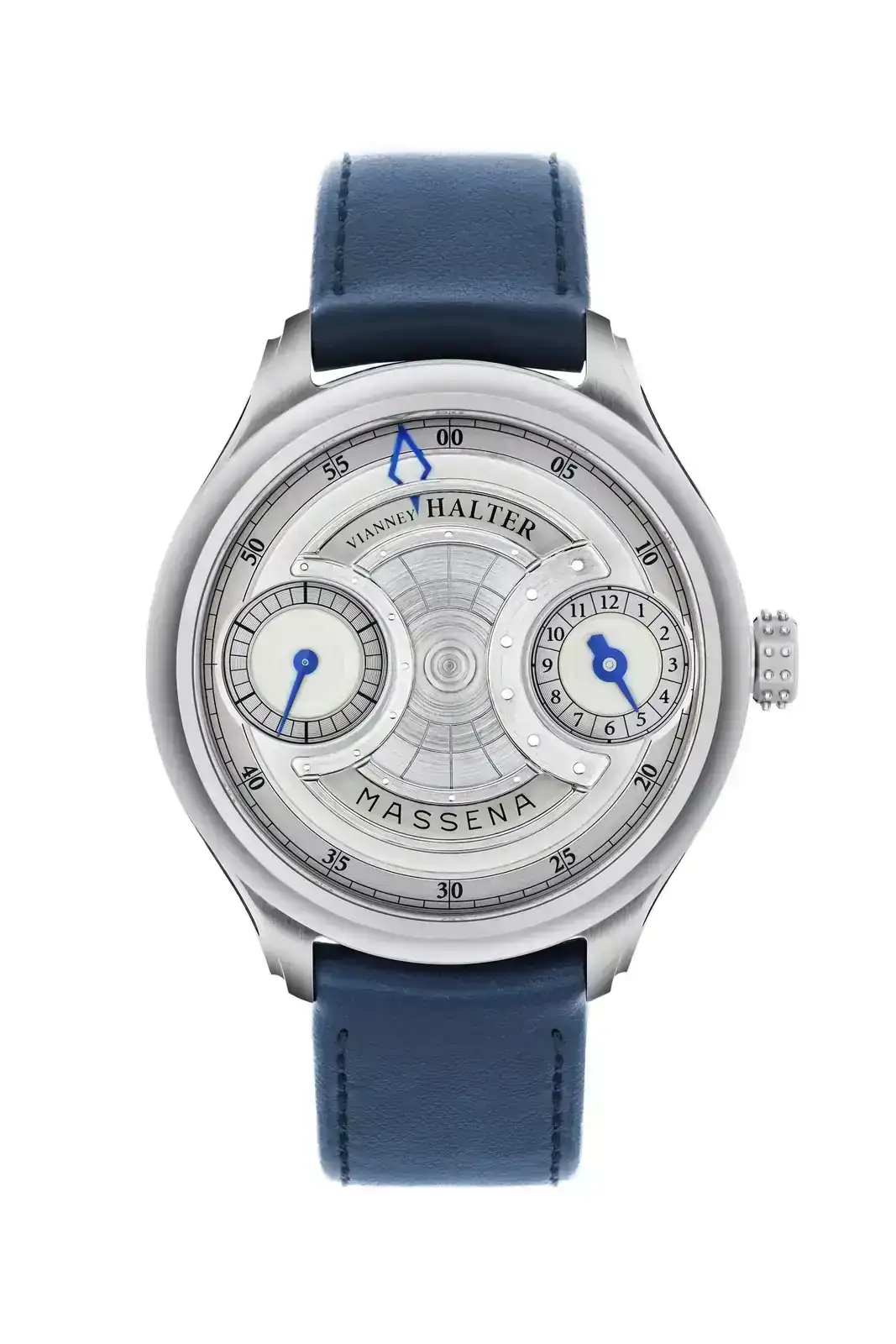 Los minutos se indican con una aguja "misteriosa" ("mystery") — un rombo azul sobre un delgado disco de zafiro. Todos los números arábigos están en la tipografía característica de Vianney Halter, y la escala de minutos tipo "ferrocarril" en el perímetro le da un aspecto vintage a la esfera.
