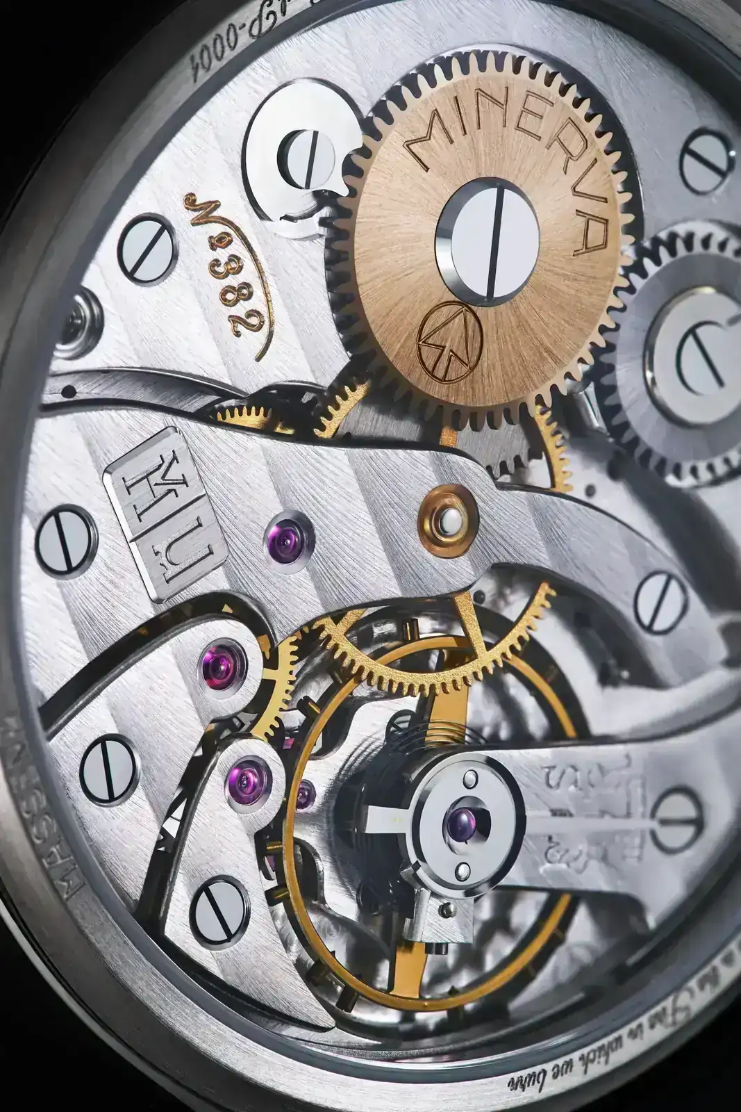 El calibre conserva el barrilete de cuerda con la firma grabada de Minerva, que proporciona una reserva de marcha de 36 horas. Está elegantemente acabado a mano con pulido "Côtes de Genève", bordes biselados en toda la arquitectura, perlado en la platina y tornillos con pulido espejo.
