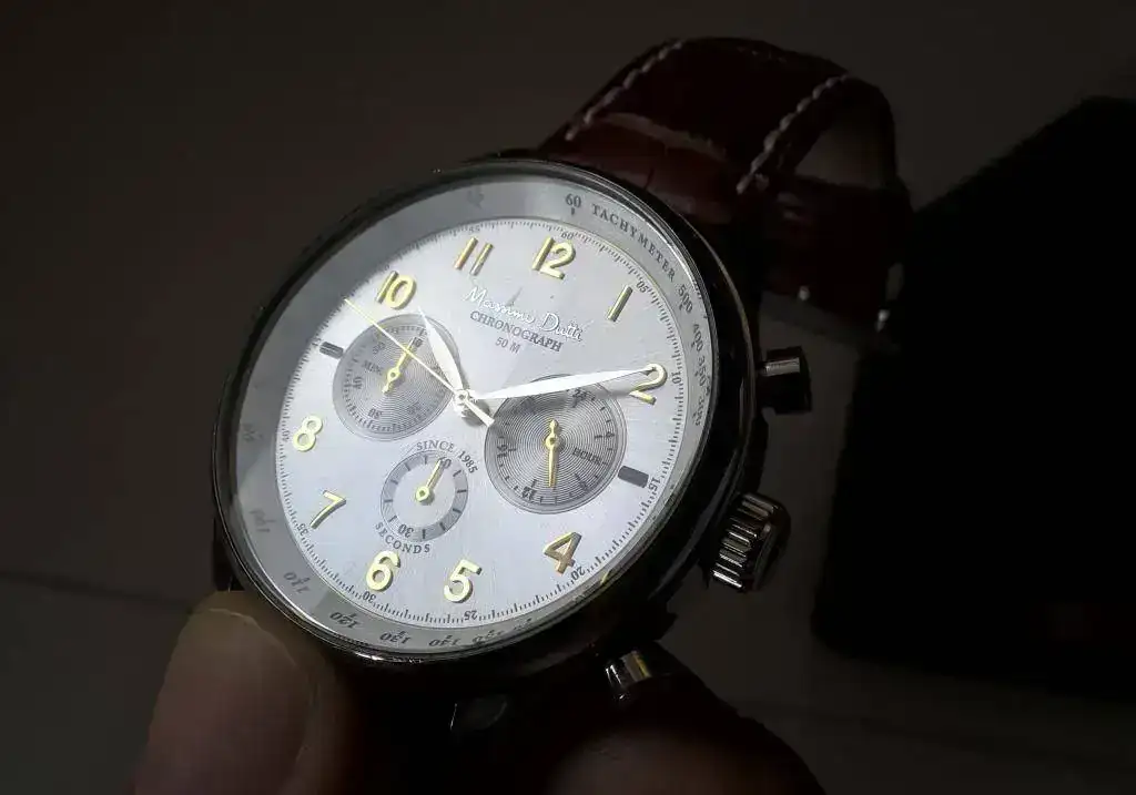 El reloj es del 2011 y durante algún tiempo fue mi reloj de diario, por lo que tiene marca de uso. La más importante es en el cristal, es como si se hubiera pelado el antireflejos (desconzco si es cristal o zafiro, y si lleva antireflejos, pero la marca parece eso) y es visible a contrareflejo (ver foto 7, justo encima de la "i" de "Massimo"). Luego tiene alguna marca más en el bisel, y en la tapa trasera más que pelillos tiene una peluca (intrigadísimo estoy por como se ha hecho eso).