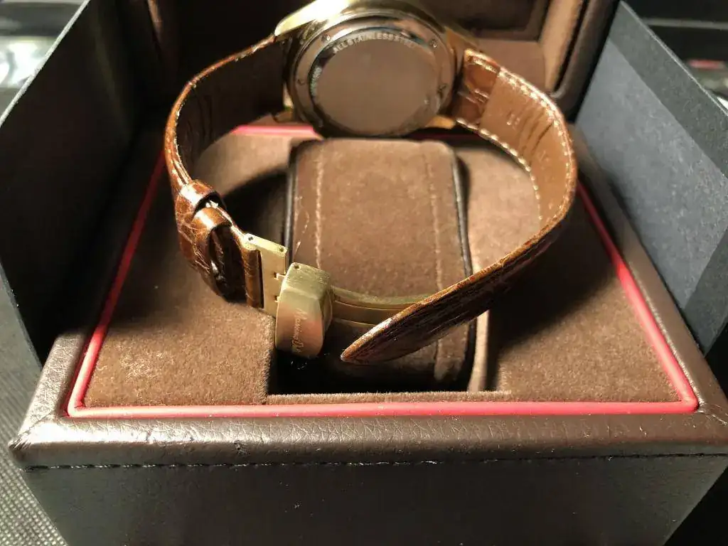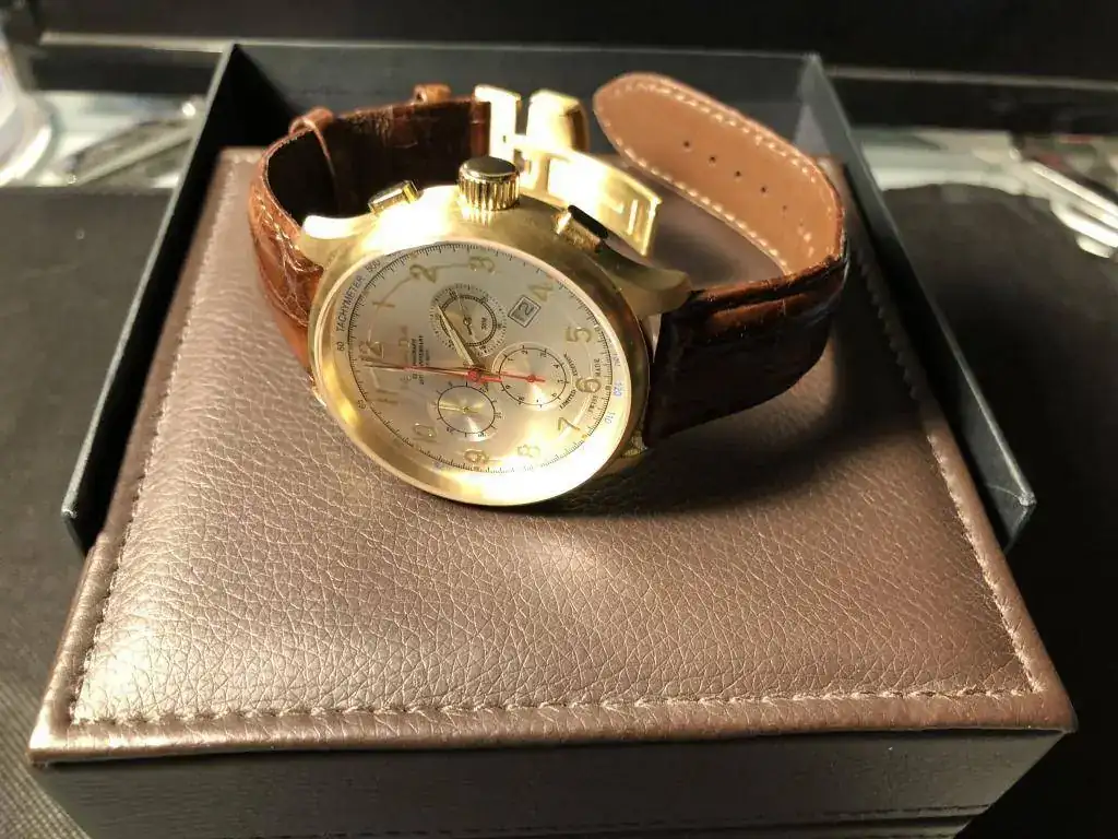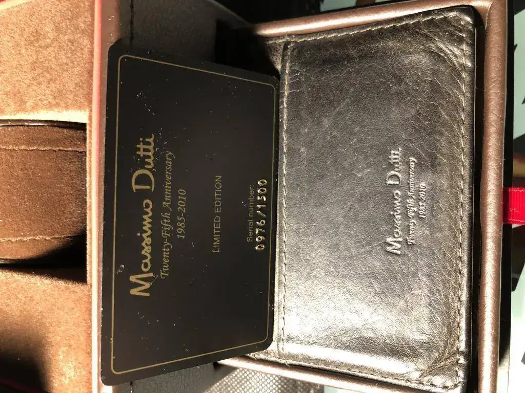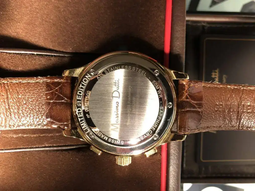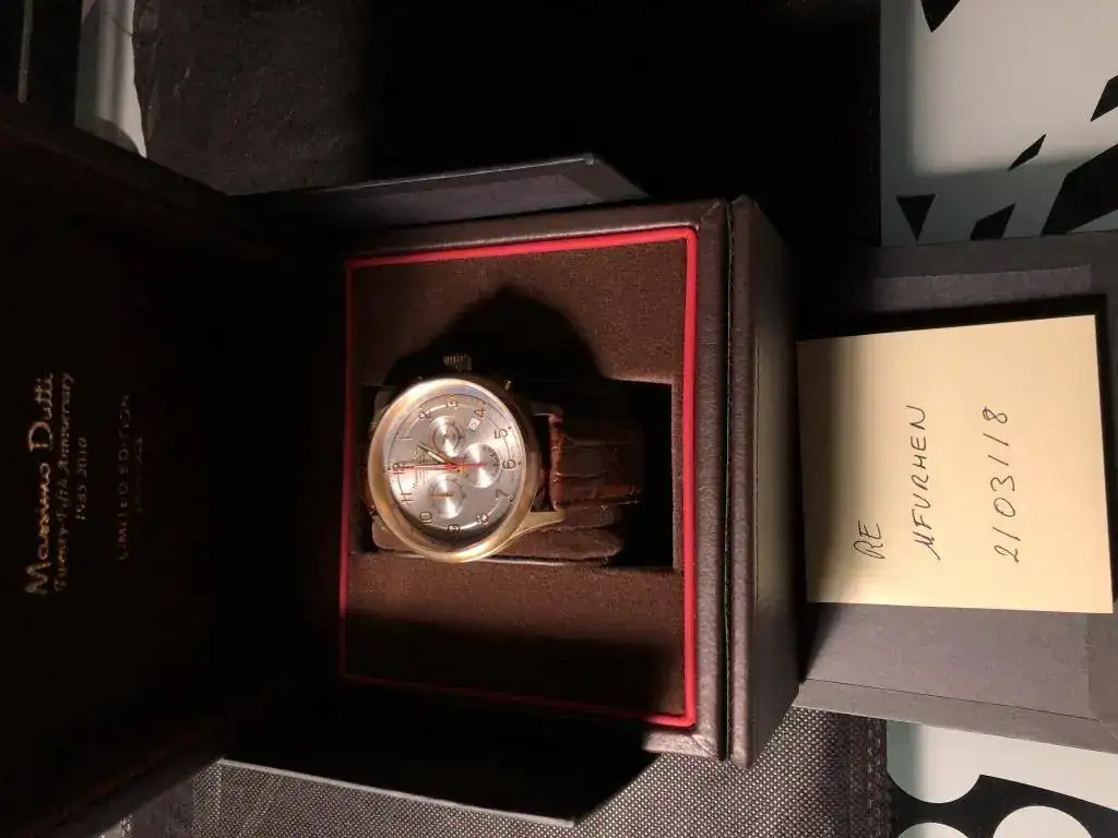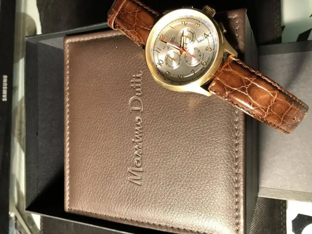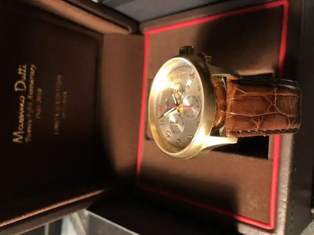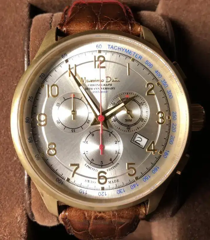 Vendo este llamativo, elegante y espectacular reloj de Massimo Dutti, en edición limitada para el 25 aniversario de la marca, solo 1500 unidades para todo el mundo. Muy difícil de conseguir, se vendió sólo en algunas tiendas. Es de una calidad superior a los otros relojes de la marca, fabricación Swiss Made, con cristal de zafiro y movimiento cronógrafo suizo de cuarzo, elegante correa de piel (le hice un agujero extra) y cierre desplegable, el reloj apenas se habrá utilizado unas 4 o 5 veces, siempre ha estado en la caja, con lo que está en un estado excelente sin marcas ni roces a destacar. Incluye tarjeta con número unidad y tarjetero de piel, que utilice durante un tiempo.