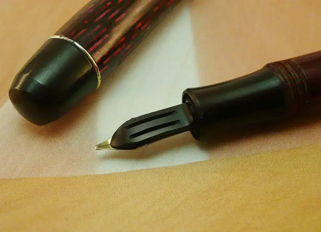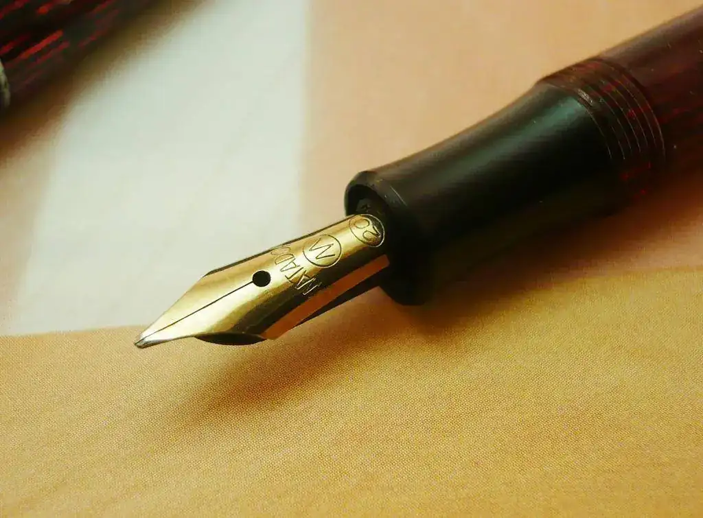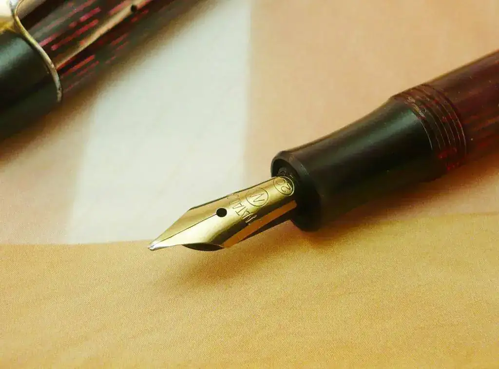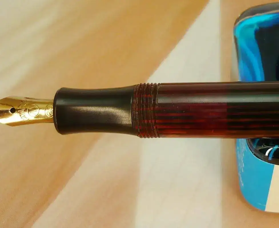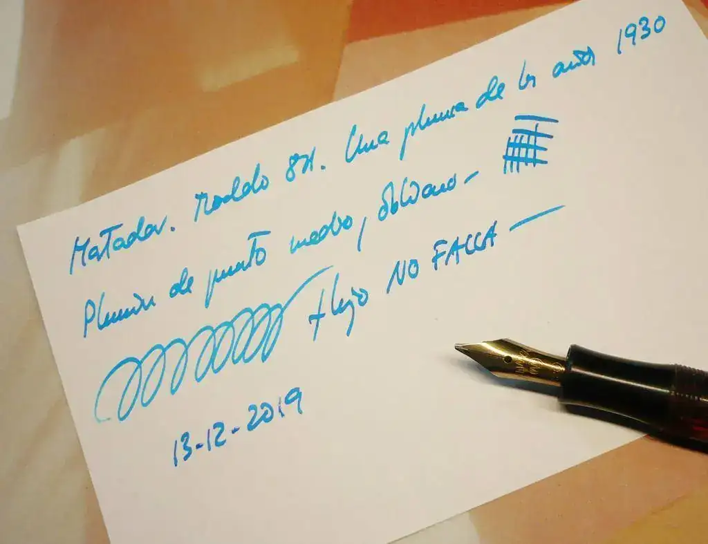 El plumín es de acero, y tiene un punto Medio/Oblículo, con buen flujo de tinta, como se puede apreciar en las imágenes.