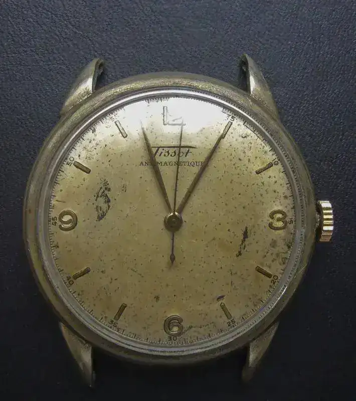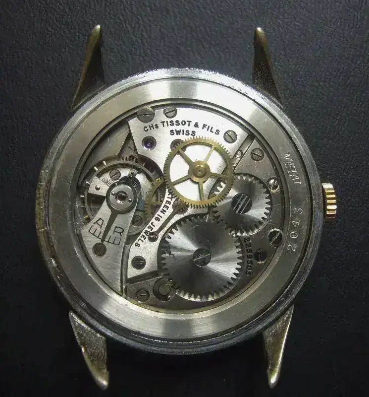 A continuación le he metido mano a un Tissot 27.2 con una extraña caja: es como si hubieran chapado en latón o bronce un núcleo de acero o bien es oro de baja calidad y muy envejecido; si mis tablas no me engañan es de 1949, así que tiempo ha tenido. En la primera de las opciones habrá ido en su día dorado pero se ha perdido todo. En éste, por ventura, no he perdido ni roto nada. Y cómo iba a funcionar si la rueda de centro la he tenido que desclavar, literalmente, para sacarla de la platina. Como para que el muelle pudiera moverla. Aún me falta que se levante el toque de queda y llevarlo a cambio de plexi. El suyo venía roto y no lo tengo de su medida, sólo he podido medio apañar éste para que no me rompa alguna aguja. Y, hablando de agujas, tengo que buscar una horaria en el taller de mi amigo porque únicamente venía el ojo. Le he puesto la más parecida que encontré.