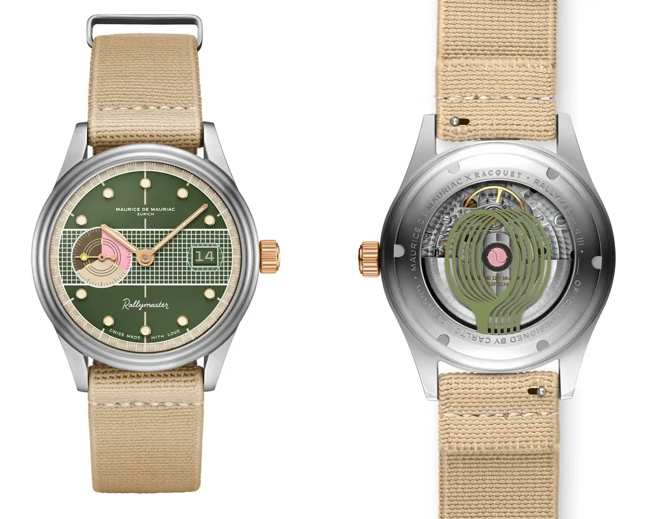 Esfera: Esfera verde con textura de "hierba" con índices aplicados y rehaut de "rally", índices aplicados con contornos dorados rellenos de Super-LumiNova® suiza personalizada de grado X1 BL; pequeño segundero a las 9 con divisiones de 20 segundos (límite de tiempo para el saque hasta el reciente cambio de reglas); agujas doradas y pequeño segundero lollipop con lume amarillo neón; inscripción "Swiss Made With Love".