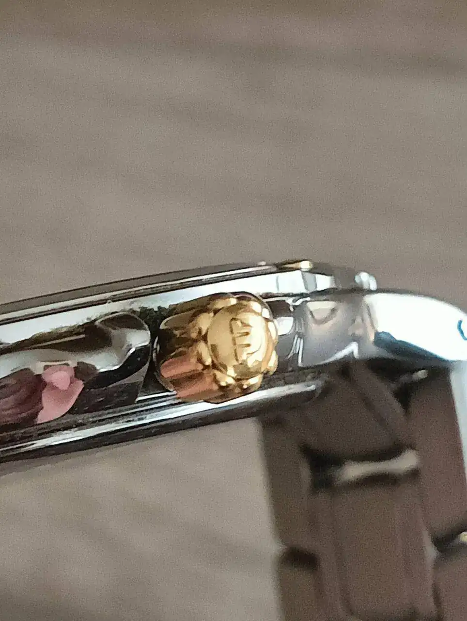 Corona, tornillos y manos de oro. Funciona perfectamente. Revisado hace dos meses con cambio de pila y junta incluido. No tiene caja ni papeles, pero irá convenientemente protegido.