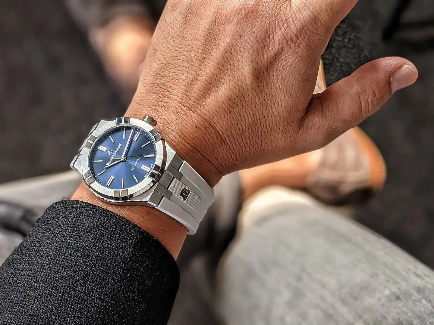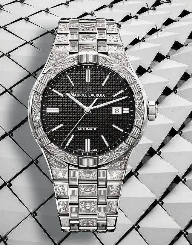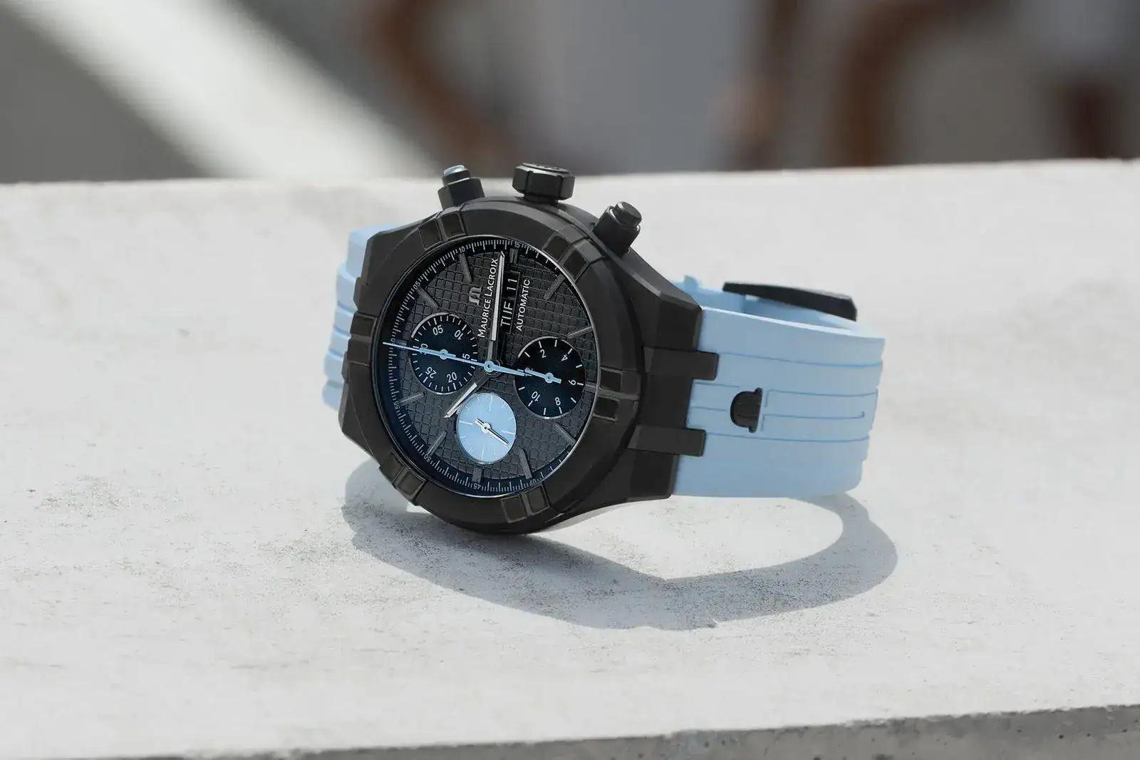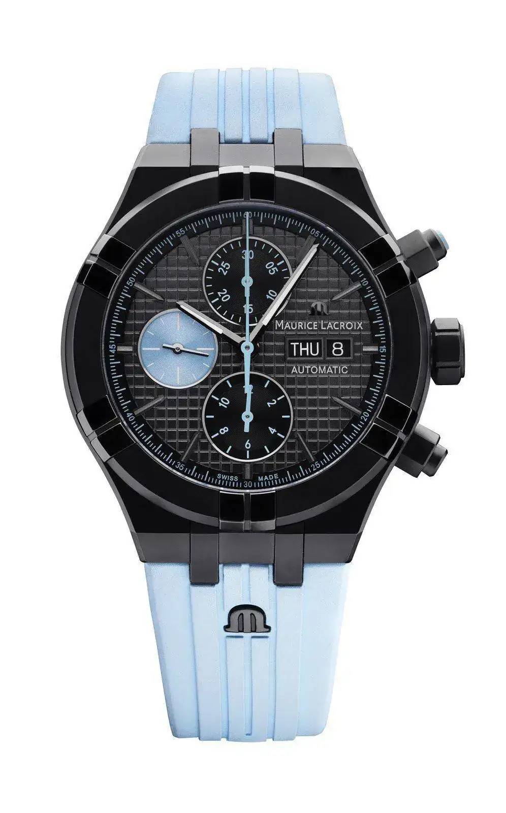 En la línea de comunicación iniciada (aunque no inventada) por Breitling de obviar la vertiente relojera y haciendo hincapié en la parte meramente estética, Maurice Lacroix presenta el Aikon Chronograph Sprint. Caja de acero con revestimiento de DLC negro y correa de caucho azul celeste. Esfera "tapisserie" en negro (disponible también en gris "gun metal").