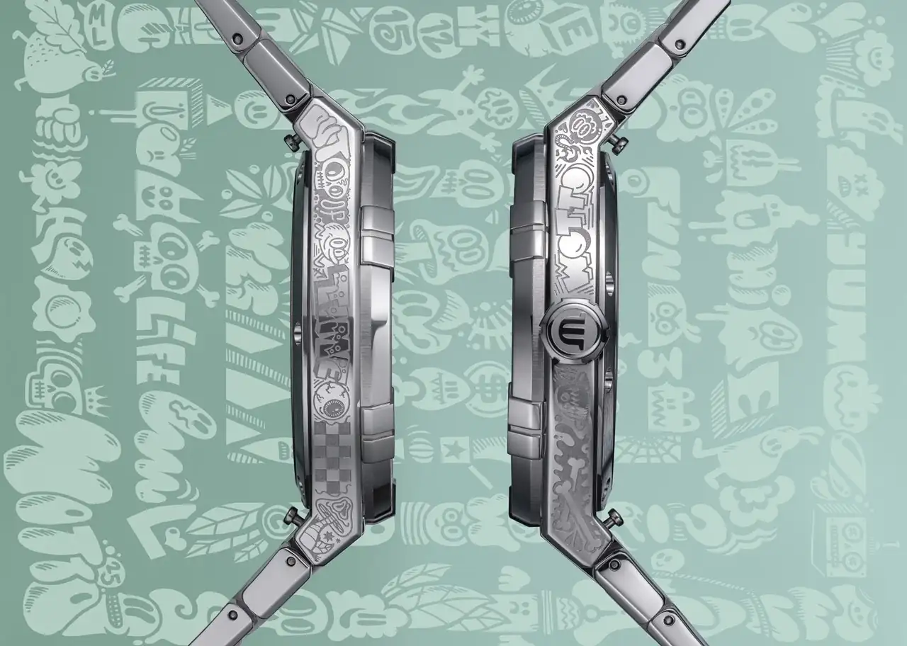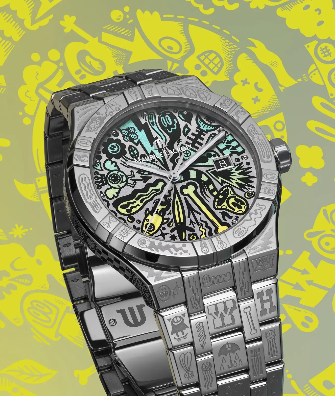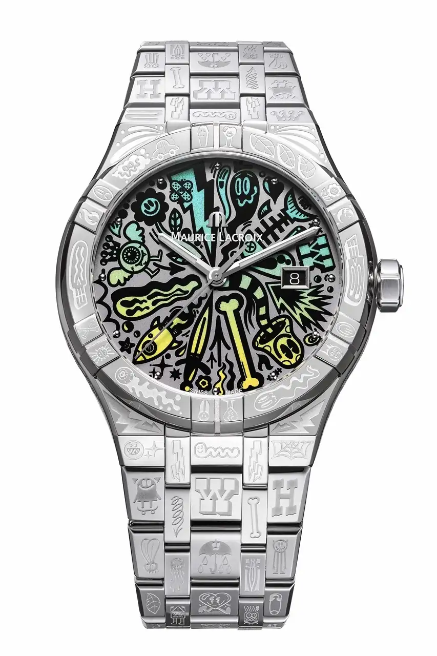 Dos años más tarde, Maurice Lacroix presenta una nueva obra, esta vez ilustrada con dibujos del artista británico afincado en California Wotto, una figura clave en la escena del arte urbano. Setas, corazoncitos, fantasmas en monopatín y relámpagos rodean la W mayúscula característica del artista, y se suceden como jeroglíficos en los eslabones del brazalete integrado del AIKON, extendiéndose hasta su caja y bisel.