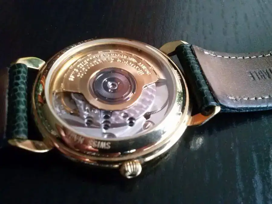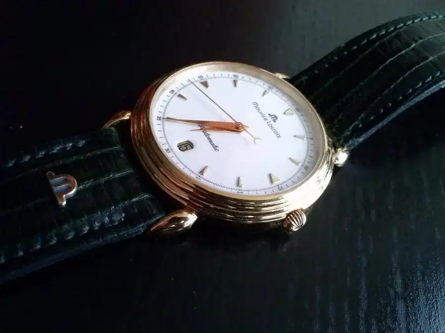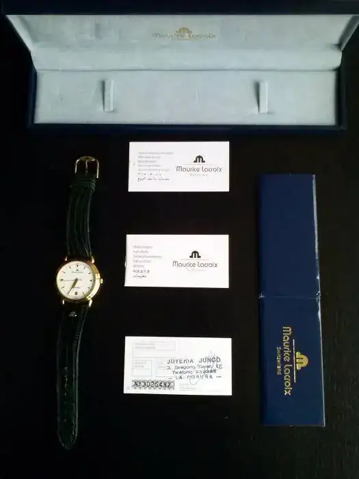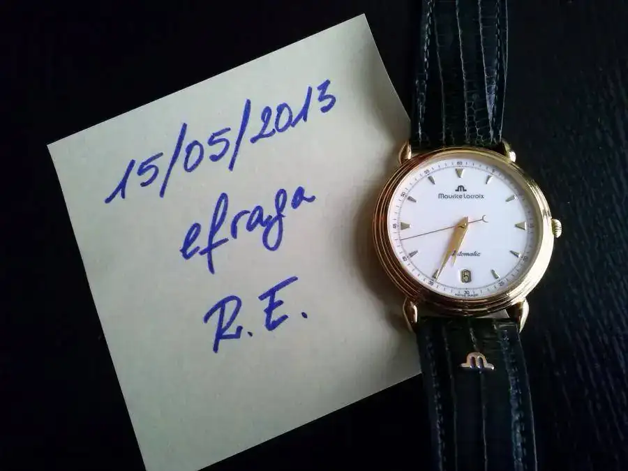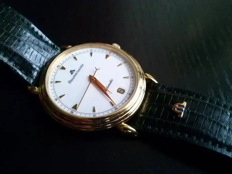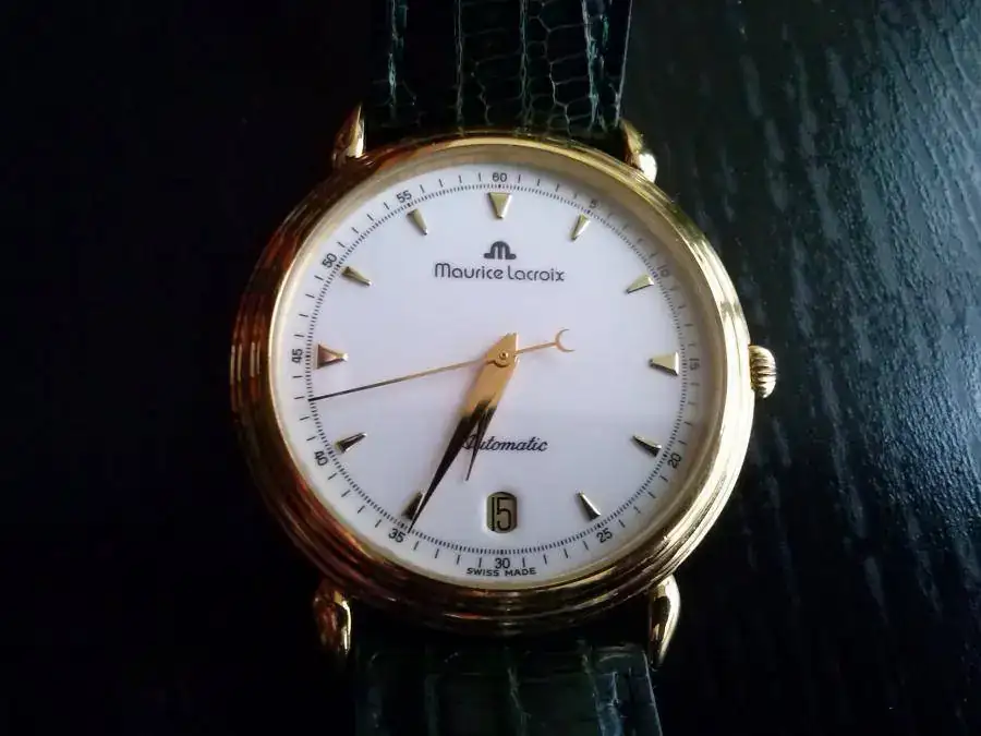 Debido a que se me ha cruzado otra pieza en el camino, vendo este elegante Maurice Lacroix Automatic Date, calibre ETA 2892-2, caja de 36.75 mm. sin contar la corona, fondo visto, correa de lagarto verde, ancho de asas 19 mm., caja chapada oro de 10 micras y esfera blanca con índices aplicados. Perfecto como reloj de vestir.