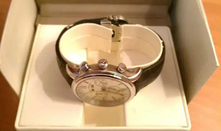Esfera/Dial: Plata, números romanos aplicados, tres subesferas, ventanas para mes y día de la semana y aguja para fecha.