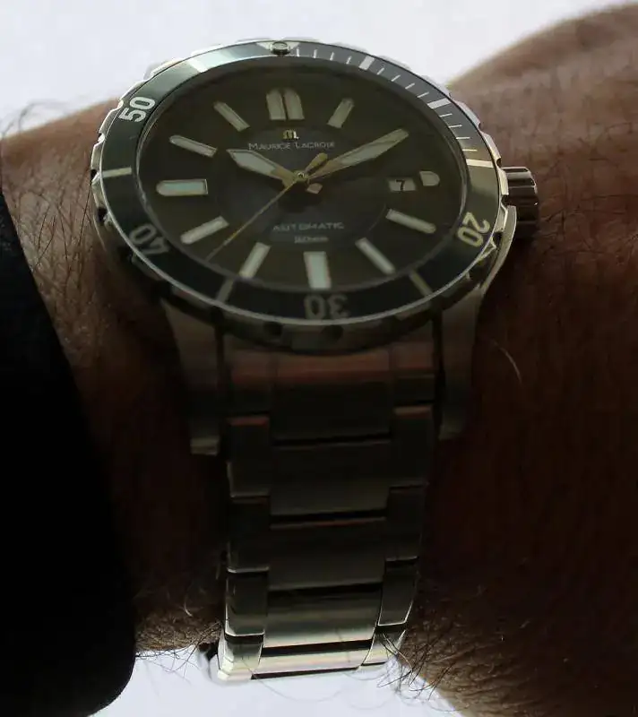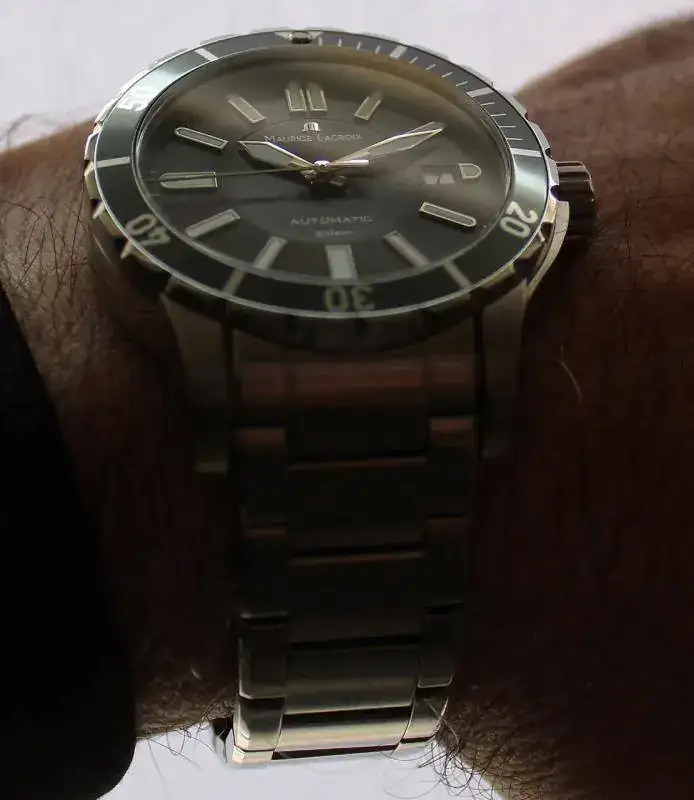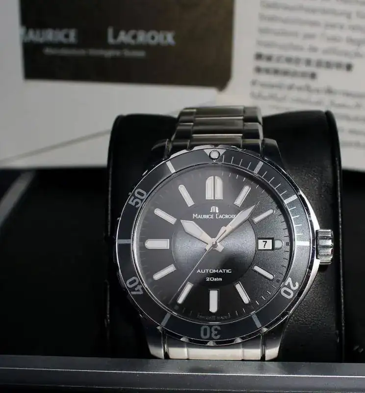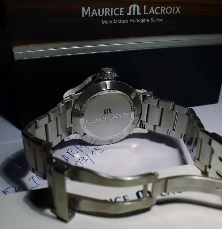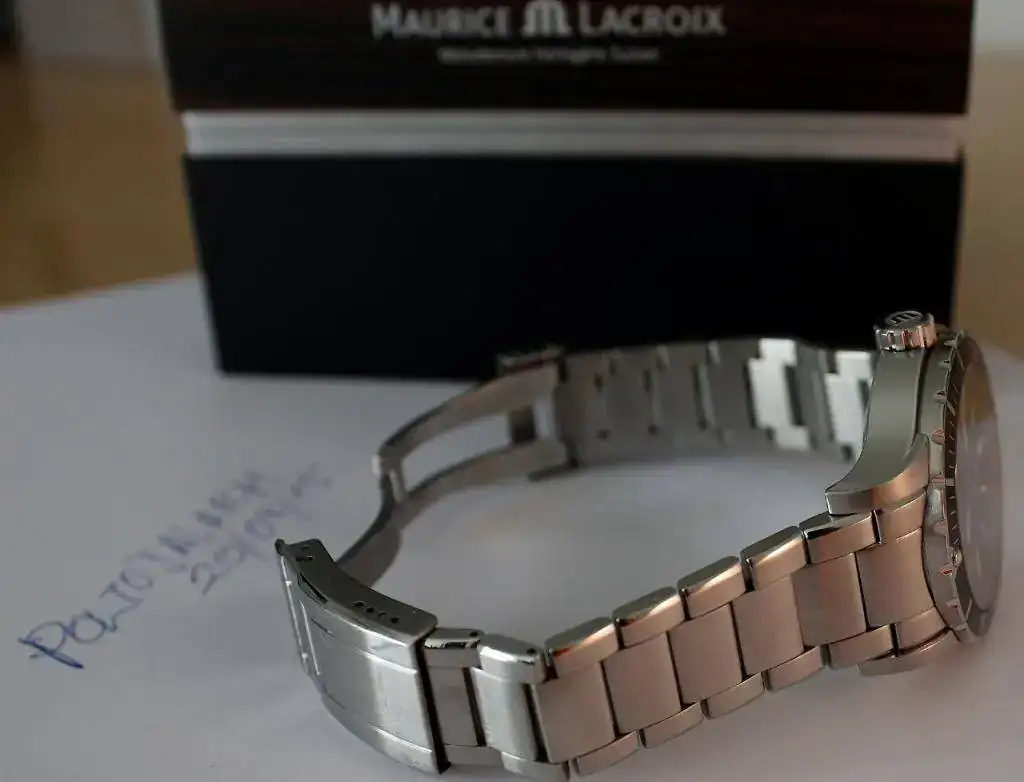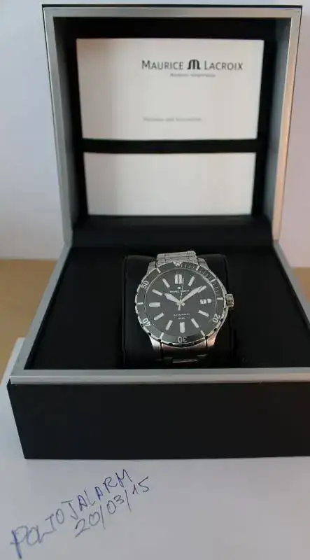 Pongo a la venta este Maurice Lacroix, he sido su único dueño y durante estos últimos ha sido mi DIVER de VESTIR, y está como nuevo. Durante mucho tiempo vestido con plásticos sólo tiene los típicos pelillos en el cierre del brazalete, también se incluyen todos los eslabones y pines. La caja en acero está impoluta, combinando cepillado y pulido, el bisel unidireccional en negro/gris (aunque a veces se le pueda ver tonos o matices verdes¿?) con indices y numero plateados, 120 clicks, con bolita.