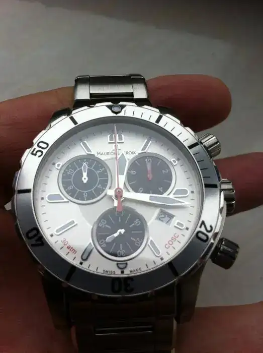 Saludos a todos.Vendo mi Maurice Lacroix Miros Diver Chrono “Silver Surfer” ref.MI1108-SS112-130 en un estado magnífico, con muy pocas puestas ypelillos muy muy leves en cierre, pero que se ven sólo a contrapelo.Como digo, el reloj se encuentra en un estado inmejorable y sufuncionamiento es preciso 100%. Cronógrafo con certificado COSC,tiene una maquinaria de cuarzo Eta 251.252, cristal de zafiro,pulsadores a rosca, al igual que la corona. La caja es de 42 mm sincontar la corona. Bisel unidireccional de aluminio. Es muy cómodode llevar y la verdad que es bonito a rabiar. Esfera plateada,sub-esferas en color negro y un lumen muy potente. Dotacióncompleta: caja exterior, interior super lujosa, documentación ycertificado COSC. Garantía ya caducada y eslabones sobrantes. Elprecio que pongo es de 505 euros, con envío incluido. No aceptocambios, pues corren malos tiempos y es preciso hacer caja.