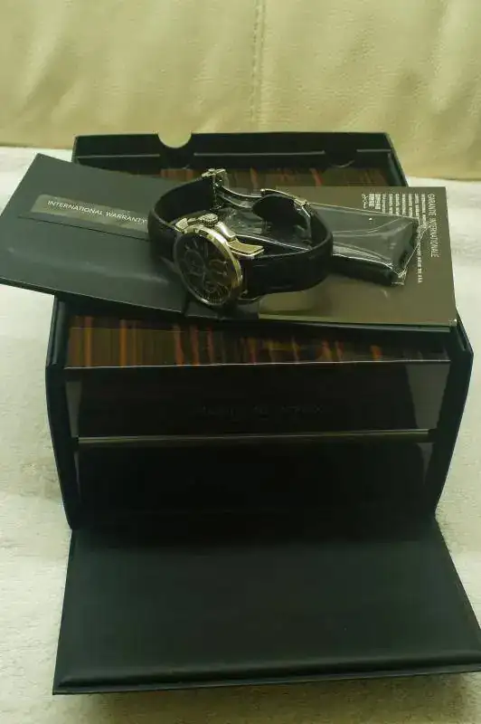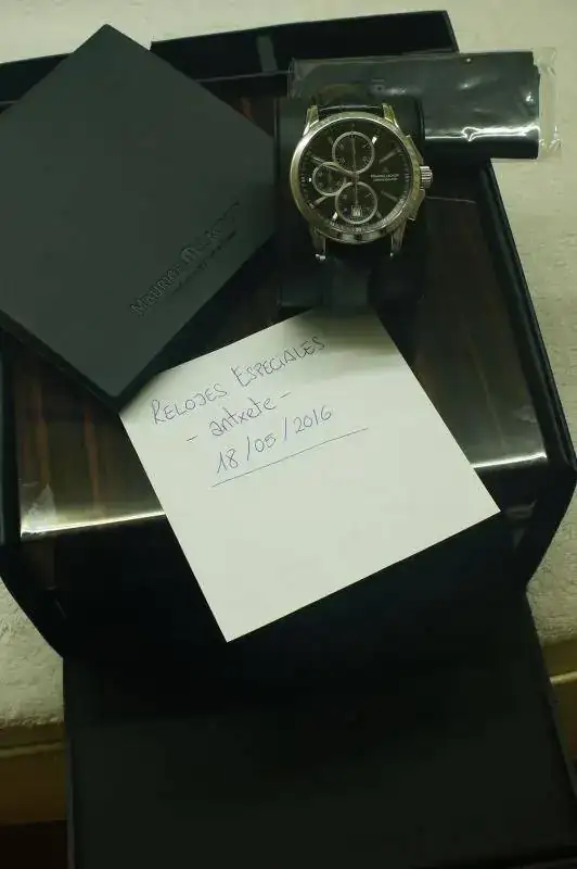 El reloj se acompaña de sus cajas originales (impresionante presentación, por cierto, de lo mejor que he visto), tarjetero, tarjeta y libro de garantía (sin sellar) y bayeta de limpieza original sin estrenar.