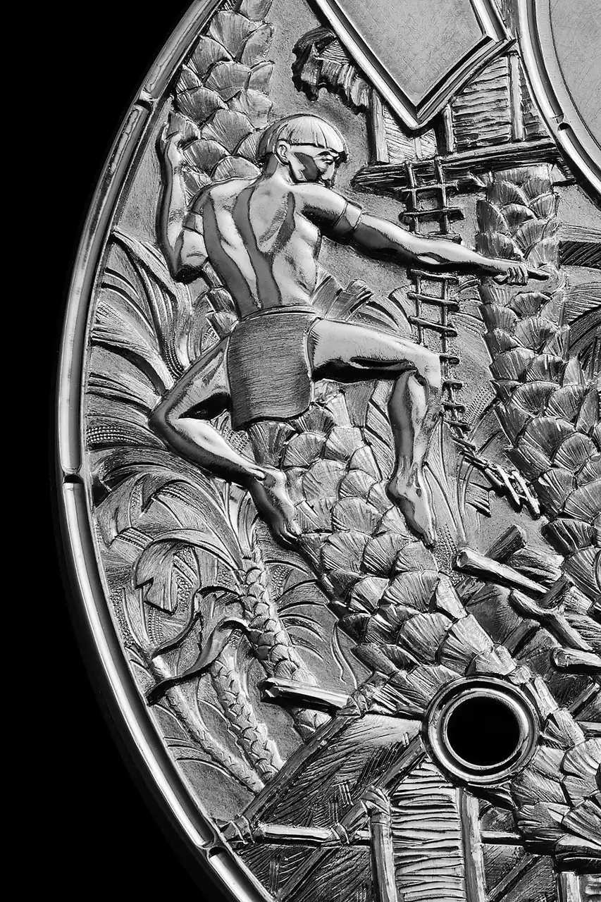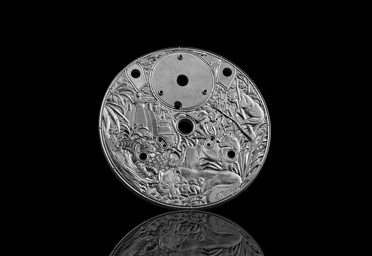Además de llevar su creatividad y destreza para el grabado al extremo, Jaquet tuvo que adaptar su arte a los requisitos y limitaciones que impone el motor de la LM SE. La esfera, el espacio destinado al grabado, que actúa realmente como platina del movimiento, presenta una superficie frontal plana. Sin embargo, en realidad, su grosor es irregular en la cara inversa, puesto que debe amoldarse a los distintos componentes del movimiento. Por tanto, proyectar la labor de grabado de la esfera como si el grosor fuera uniforme no habría sido una buena opción: era necesario prestar mucha atención a las zonas más finas para no perforar inintencionadamente el lienzo artístico en caso de que una sección concreta requiriera un grabado con un relieve profundo.