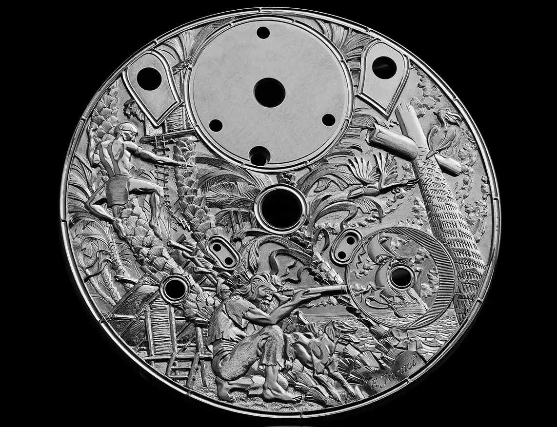 La relojería también tiene sus estrellas de rock, nombres que suscitan inmediatamente admiración y respeto cuando se asocian con un reloj. Los aficionados a la relojería conocen sobradamente la obra de artífices de movimientos como Jean-François Mojon, Kari Voutilainen, Jean-Marc Wiederrecht, Stepan Sarpaneva, Eric Coudray y Stephen McDonnell. Por su parte, algunos diseñadores como Eric Giroud y Alain Silberstein se han ganado la devoción de sus seguidores más fieles. Sin embargo, a tan solo un pequeño puñado de expertos le sonará el nombre de Eddy Jaquet, uno de los artistas con más talento de su generación y el mejor narrador capaz de expresar su arte a través del grabado de esferas.