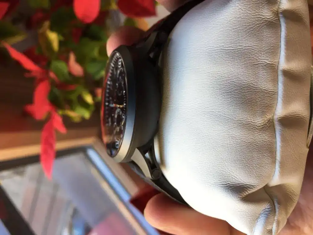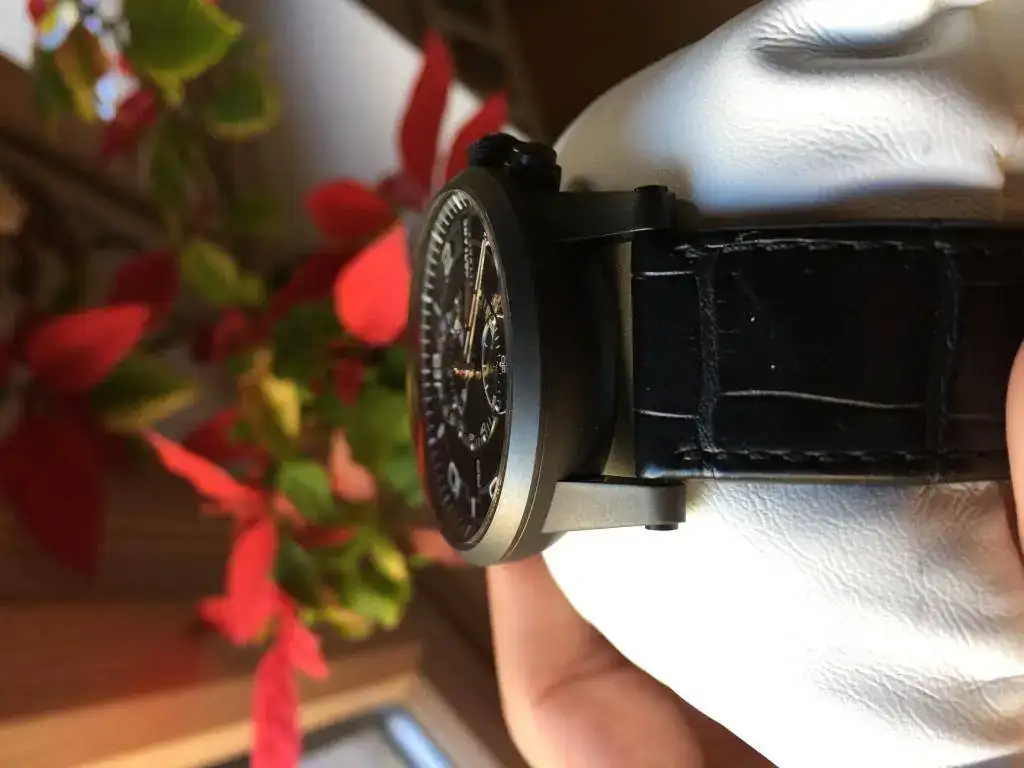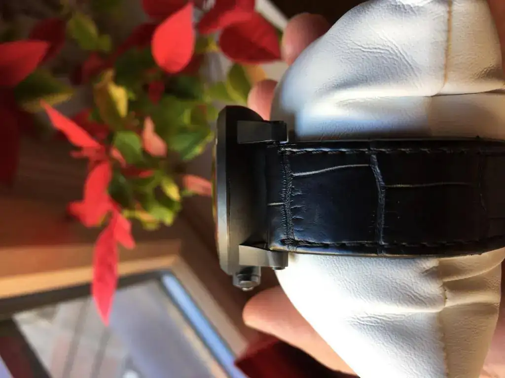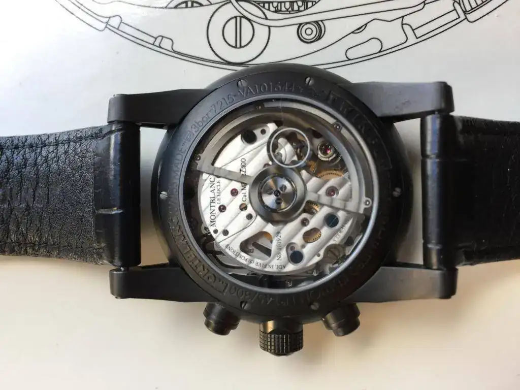 La caja es titanio bañado en diamante en carbono. Le da una dureza extraordinaria al titanio y es prácticamente imposible de rayar y no pierde pintura como en el PVD. La caja es muy ligera y ha sido diseñada por Giampero Bodino (mismo diseñador que diseño la caja del Panerai Luminor, de hay cierto aire de la caja a PAM). Trasera vista de Zafiro.