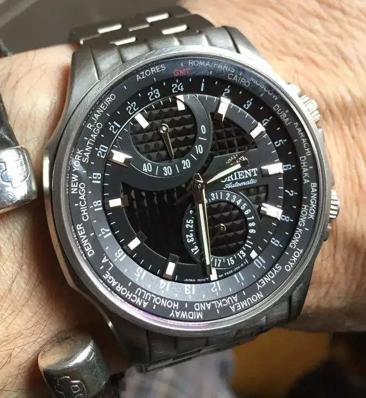 Y este es el Orient, 175 euros, automático y cristal de zafiro, maquinaria a la vista por detras y pantalla en fibra de carbono.. Me pareció muy original y de buena pinta, aunque ando un poco perdido con la marca....... Qué tal es??