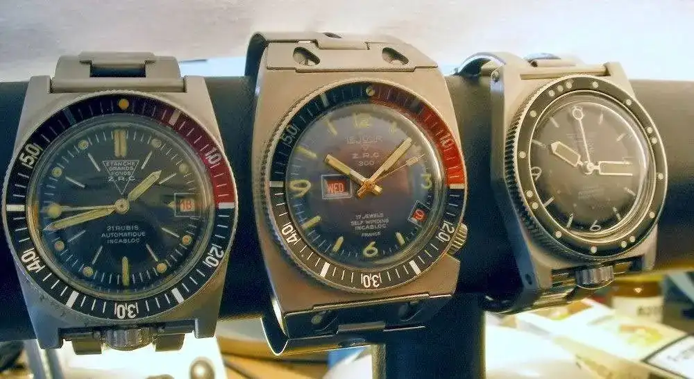 La correa es de goma negra, tres o cuatro hendiduras a lo largo de la correa. Esfera negra, marcas de minutos en acero fino y algo alargadas, sin ninguna complicación que recuerde, solo manecillas de segundos, minutos y horas. Caja de acero. En líneas general un reloj fino y elegante, nada recargado.