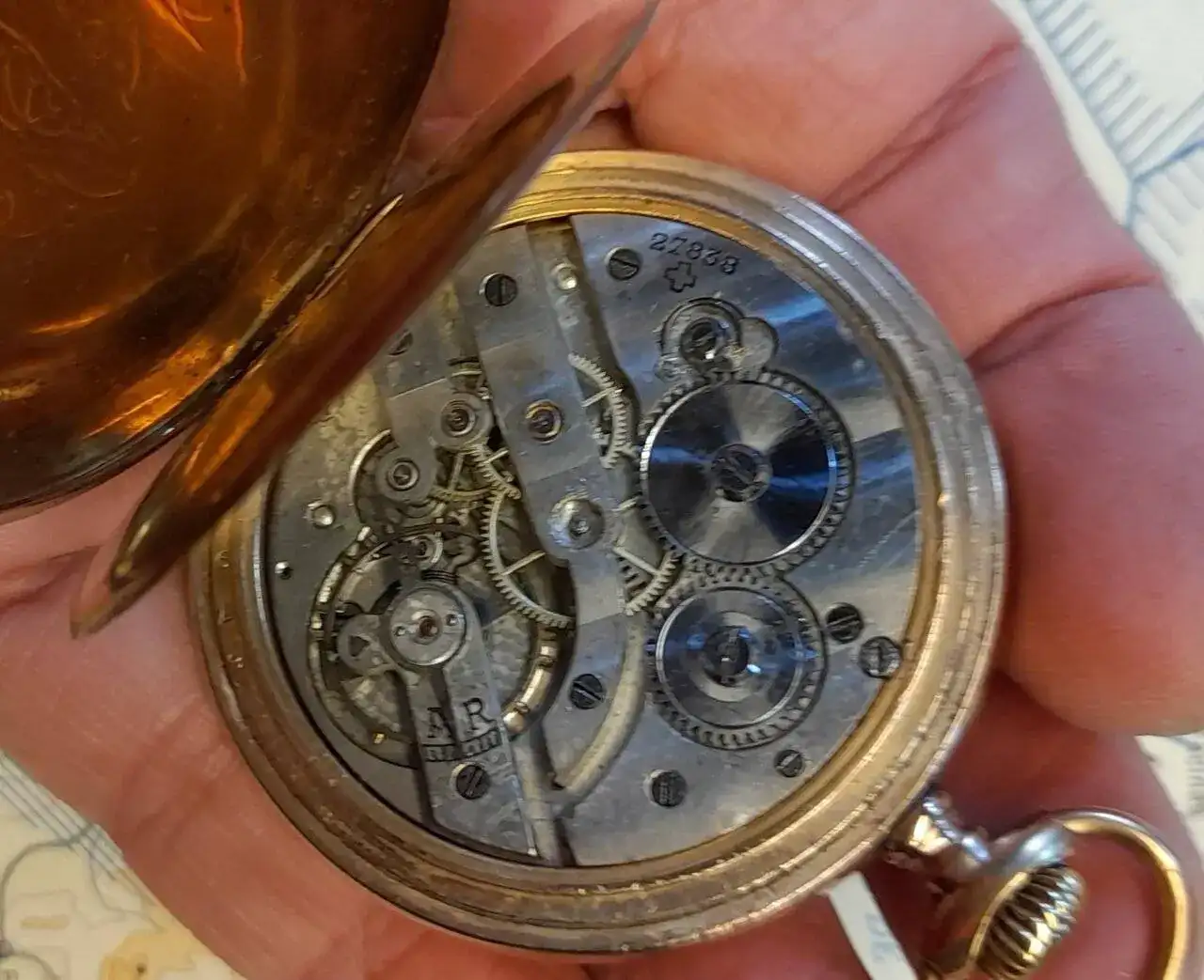 Caja de tipo Lepine de 50 mm de diámetro, chapada en oro, con tapa posterior y tapa guardapolvo. La tapa posterior tiene un grabado Guilloché bastante desgastado por el uso, con cartela central.