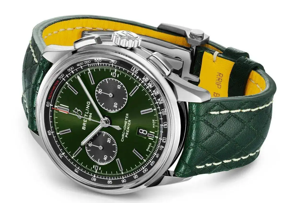Excelente gusto. Ese modelo es el Premier Bentley British Racing Green y en mi opinión es mejor adquirirlo con su correa específica de piel verde a juego, creo que es parte de su esencia. Adicionalmente como accesorio y para usarlo en verano se puede adquirir el armis de acero, que es el mismo para todos los Premier. Hay otras correas de piel compartidas por varios modelos, pero la verde-amarilla decorada en rombos es específica de ese Bentley Premier. Imprescindible.