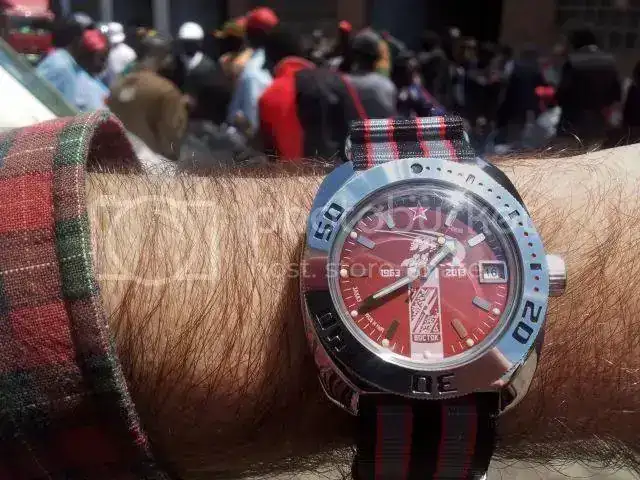 La tercera, en un asentamiento de inmigrantes ilegales, con un Vostok Amphibia edición especial Misión Vostok 5/6.