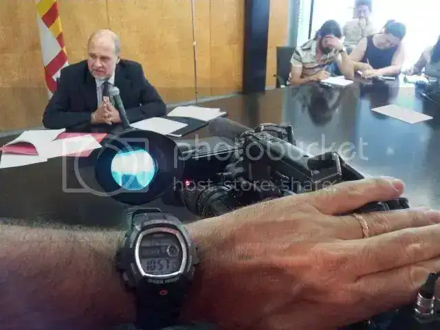 En una rueda de prensa, con un Casio GW-7500 con alarma vibradora.
