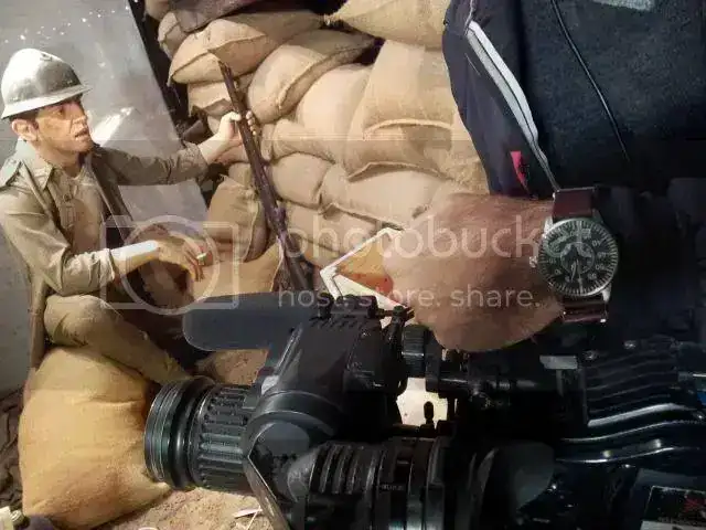 La primera, con un Laco Pilot Aachen, en un museo sobre la batalla del Ebro de la Guerra Civil, delante de la foto de un bombardero