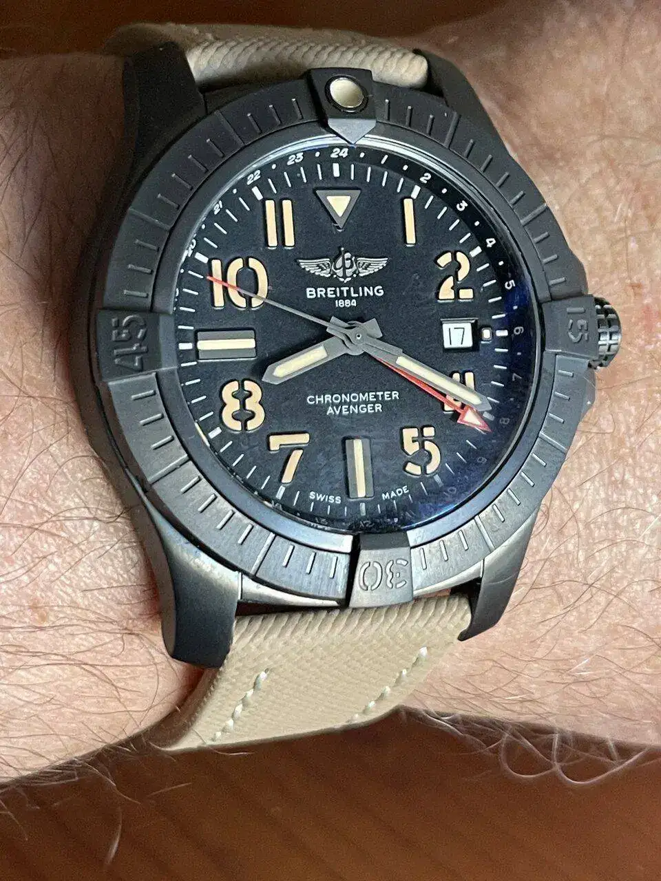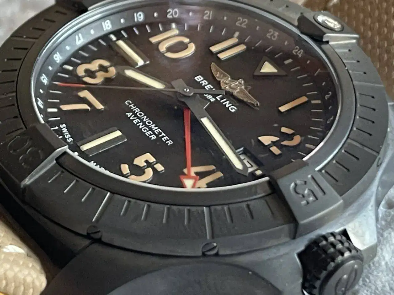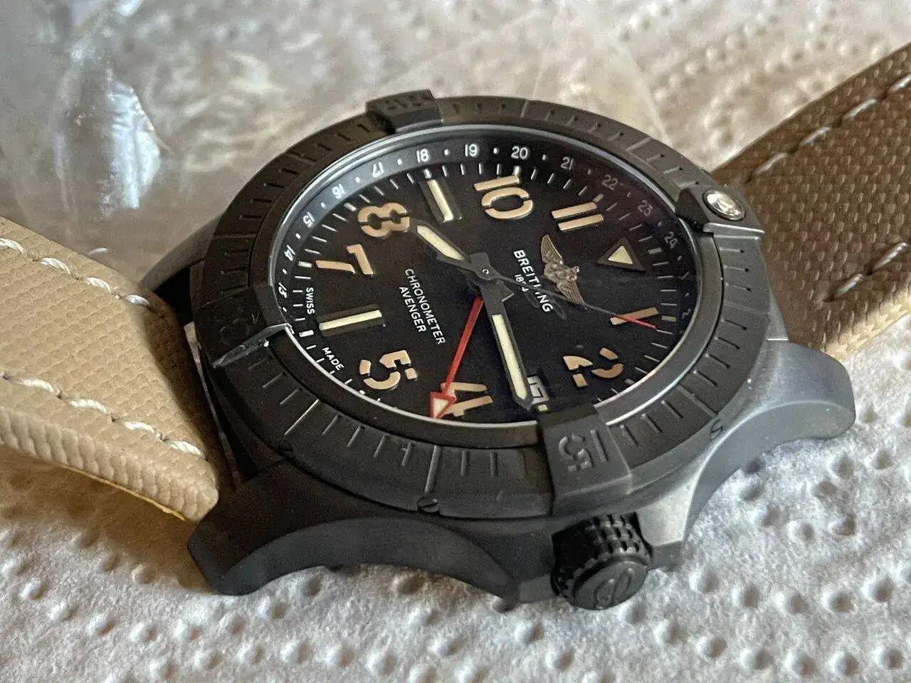 Hacía tiempo que no tenía en mi caja un Breitling y eso es pecado morral, en toda caja no debe faltar uno, el elegido? Pues el que presento, morenito él ya tostado por el sol y con su correa color arena del desierto, en fin, espero os guste, ah, y sus 45 de caja para nada lo parecen, diría que la sensación será de máximo 43 o 42,5 mm.será el colór?