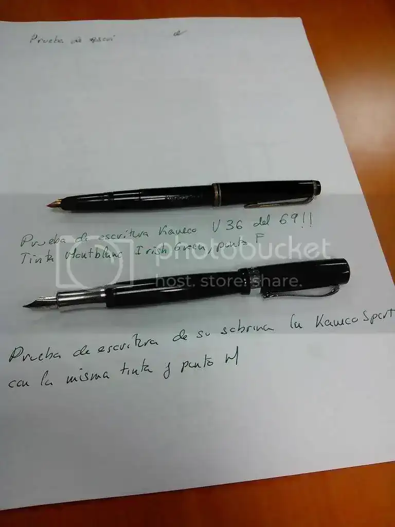 con la escritura. El punto es un F, no raspa casi nada y el flujo es magnífico. El tono que le da a la Irish Green no tiene nada que ver con su sobrina (kaweco sport que me trajeron los Reyes este año), es mucho más claro, debido al menor grosor del punto. Me queda por controlar que no pierda tinta por la grieta y que no pierda tinta por el pistón pero las impresiones son buenísimas. Creo que le queda una nueva vida de curro.