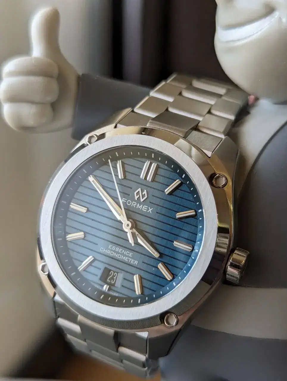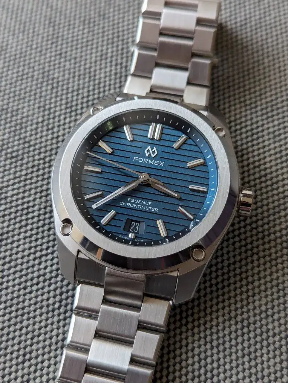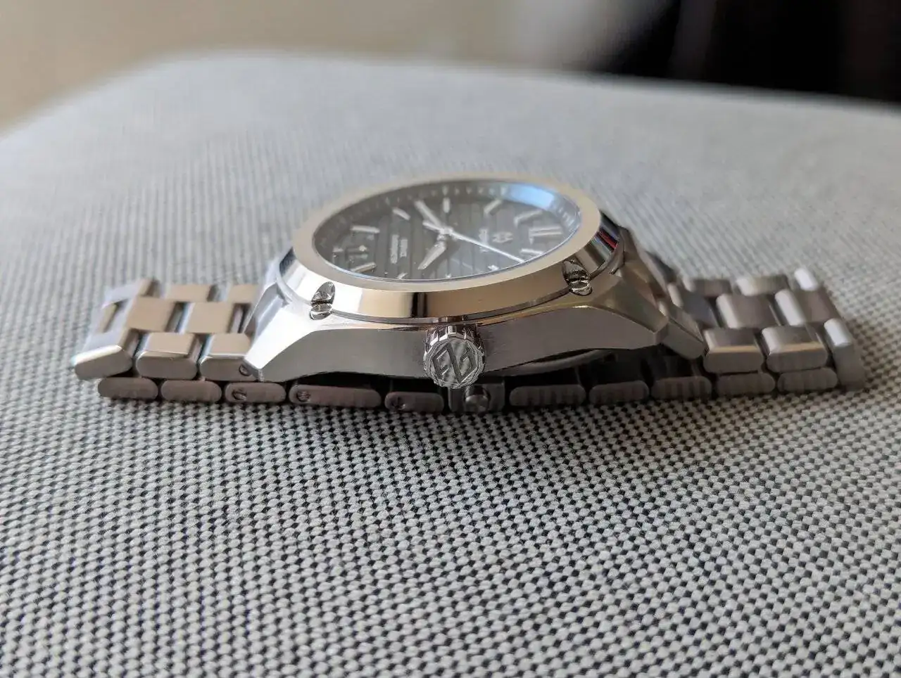 La caja tiene un gran acabado y un diseño caracteristico. No soy muy fan de tornillos o parecidos en las cajas pero tampoco me desagrada. Cuando miras el reloj frontalmente es realmente bonito. El bisel pulido y cepillado mola mucho y aun mas su esfera. Creo que es la primera esfera que veo de este estilo. Hasta ahora vi acabados mate, acabados rayos de sol, texturizadas pero con grabados de este estilo no, me gusta el caracter que le da. Los marcadores aplicados y agujas, tambien se ven de buena calidad. La fecha esta en color negro, se nota pero queda disimulada.