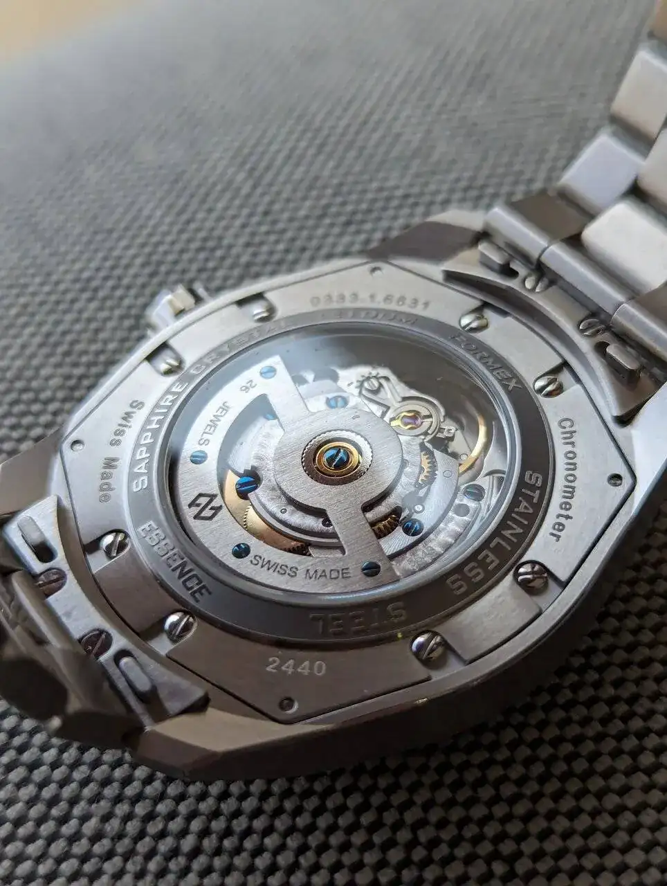 La ventana al calibe es bonita y se ve el mecanismo que permite levantar la caja hacia arriba para adaptarse mejor a la muñeca. Del calibre no tengo mucho a aportar por no ser muy entendido. Es una Sellita Sw200-1 y viene con certificado Cosc.