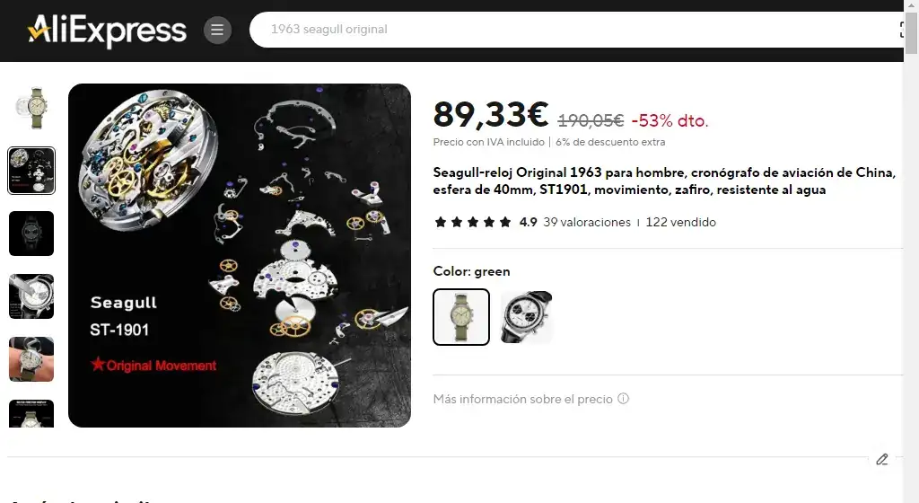 Además, no es automático y el dial pequeño de la derecha marca las 24 horas. El cronógrafo funciona pero cuando lo paro y lo reseteo a 0, lo hace bien, pero el segundero del dial pequeño de la izquierda no se mueve. Ósea que, la aguja roja del cronógrafo se queda en las 12 como tiene que ser, pero ya no se mueve el segundero (no sé si me explico) vamos que no tiene segundero que se mueva cuando esté marcando la hora. Al cabo de un rato, marca bien la hora, por lo que deduzco que está funcionando.