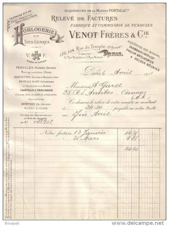 V. F. (mit Malteserkreuz-Stellungsrad) | | | Uhren, Uhrwerke; Rue du Temple 132-134, Paris, Frankreich; wohl der ursprüngliche Eigentümer dieser Marke |