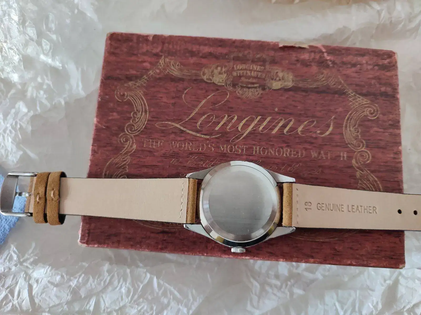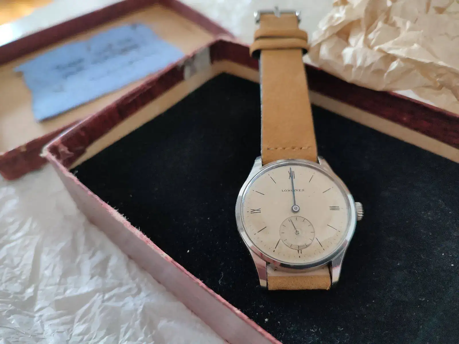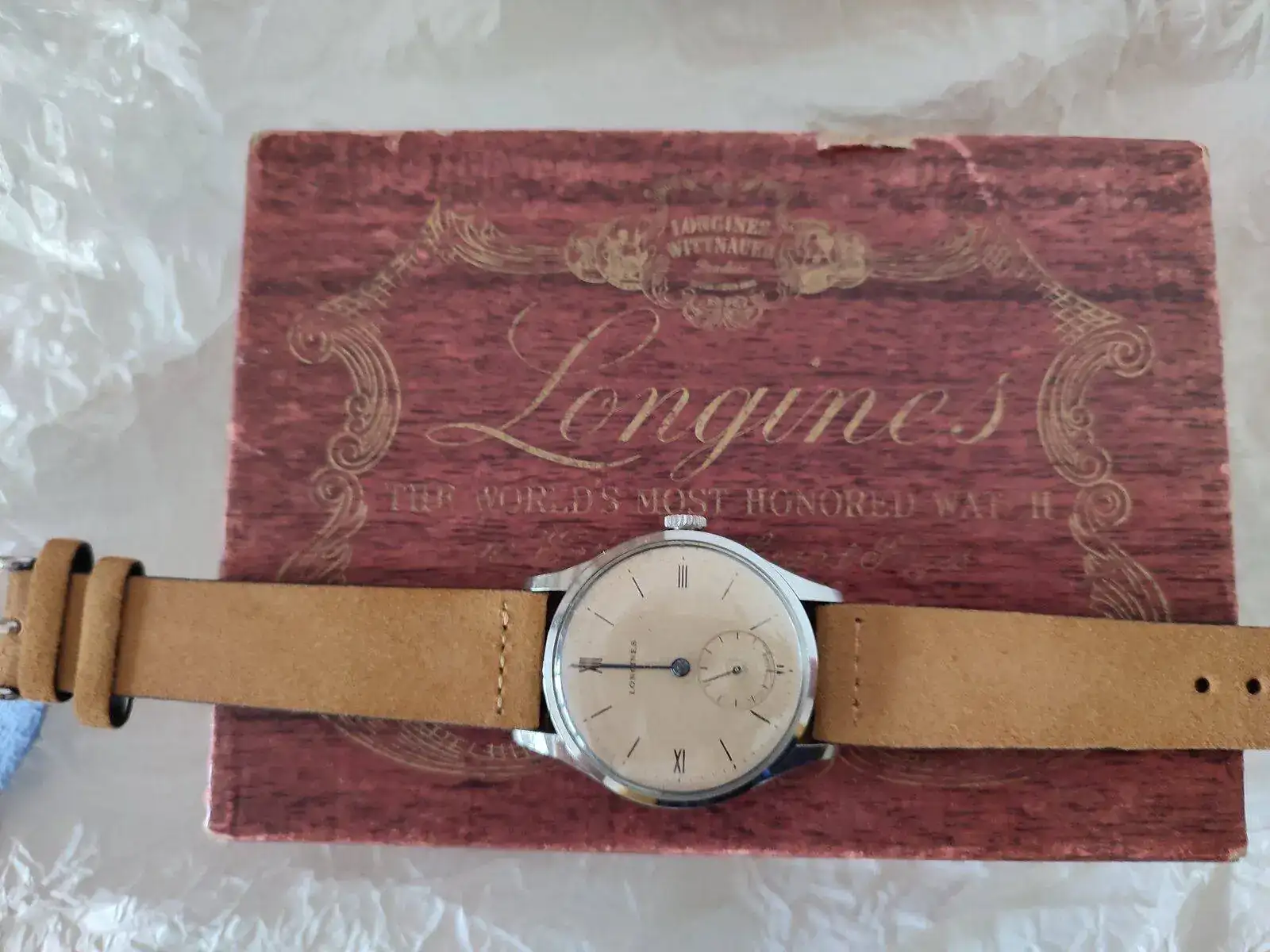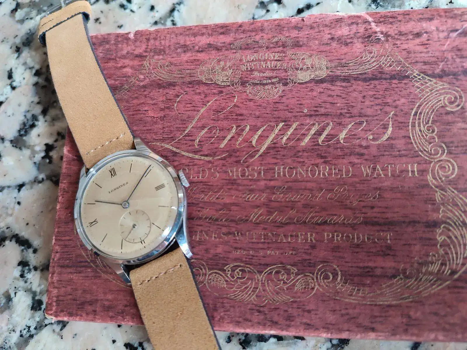 Esto es! Un Longines de los 40's que al tocarlo es una pasada! No se llega ha apreciar lo azul de las manecillas, la caja esta perfectamente bien (tengo relojes de 6 dÃas en peores condiciones) y una pátina muy loca! El cristal igual de bien. Imagino que algún remplazo llevará ya que son 80 tacos los que tiene, y tampoco soy de los que se ponen muy exquisitos en ese aspecto. Transmite los años que tiene y para mi eso es lo importante.
