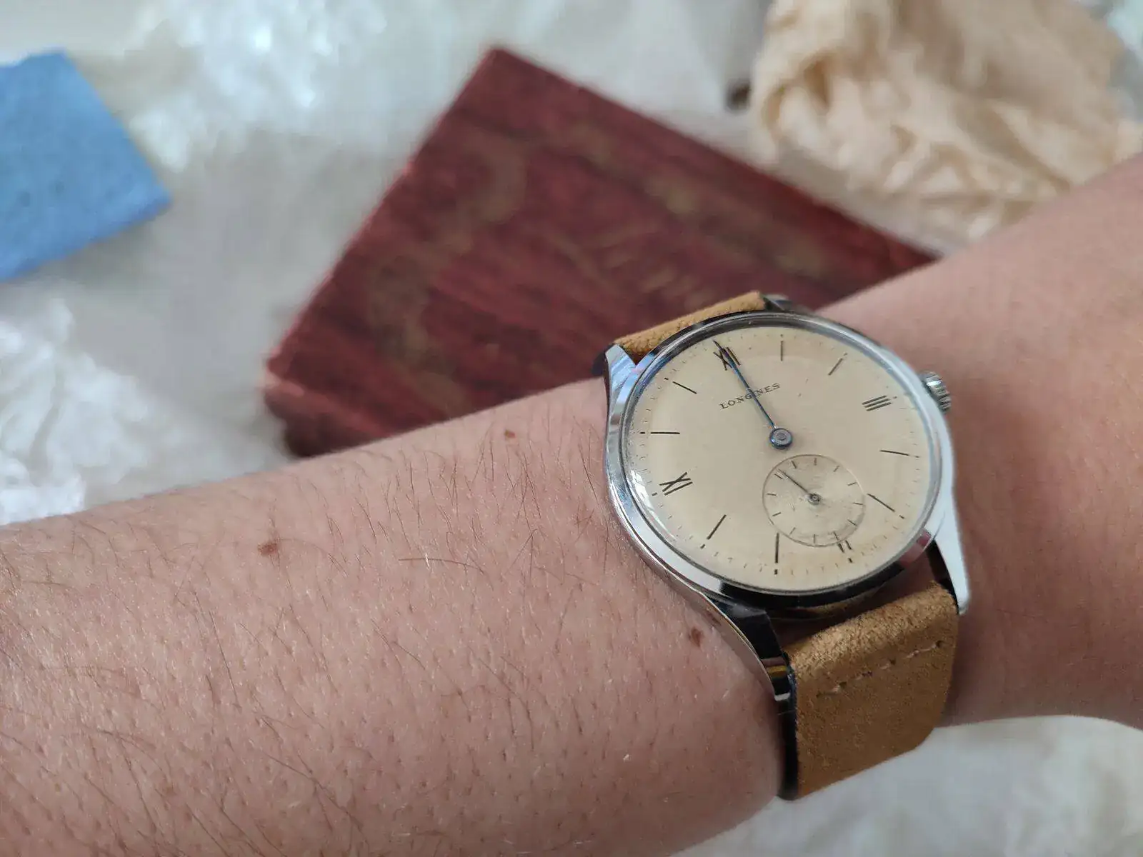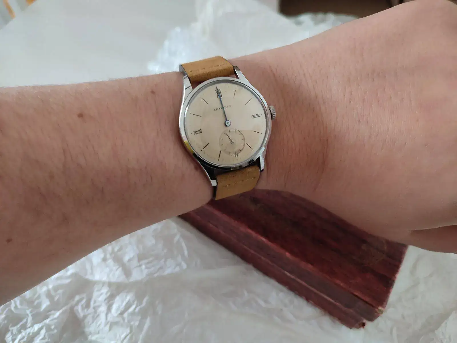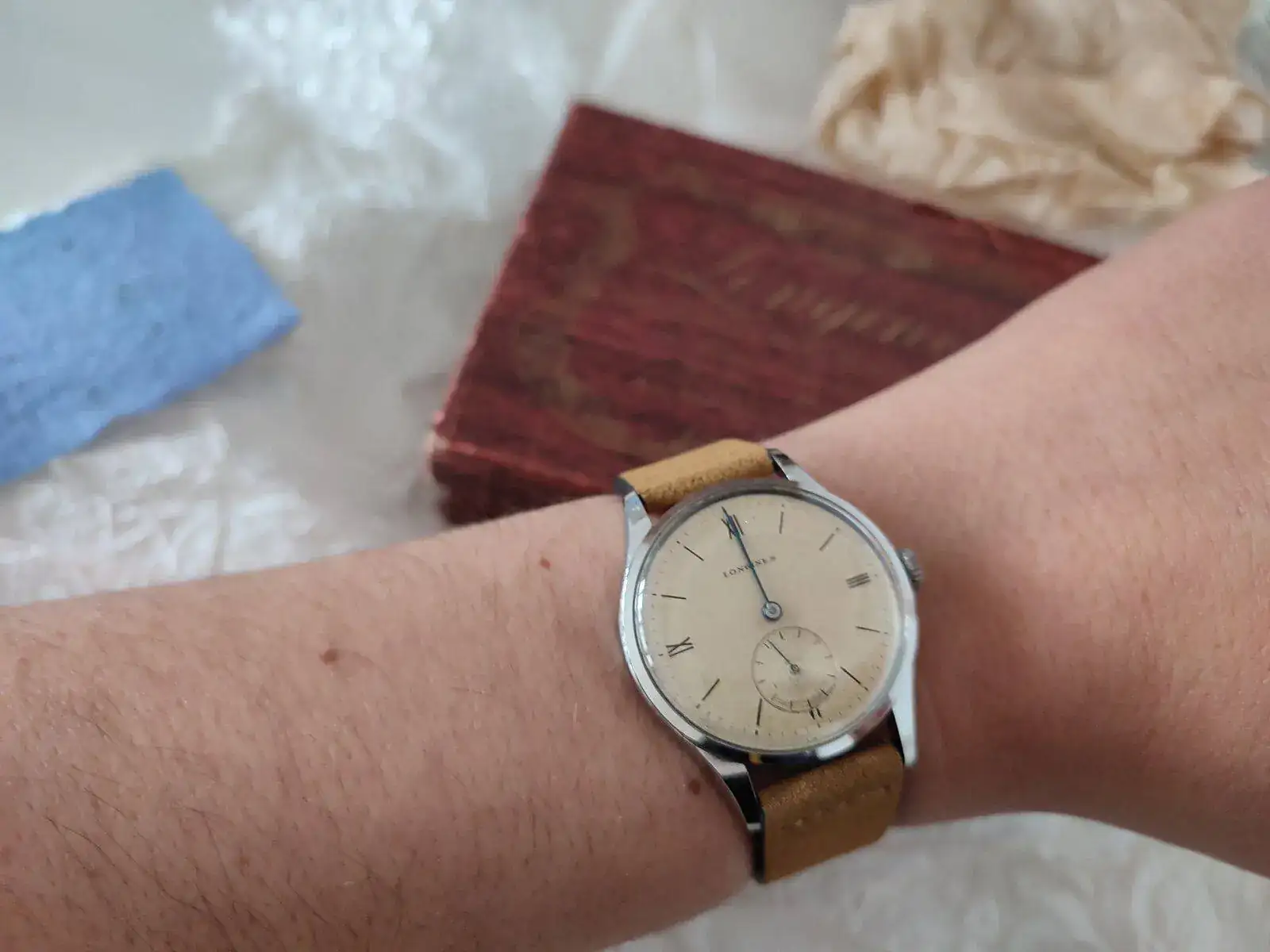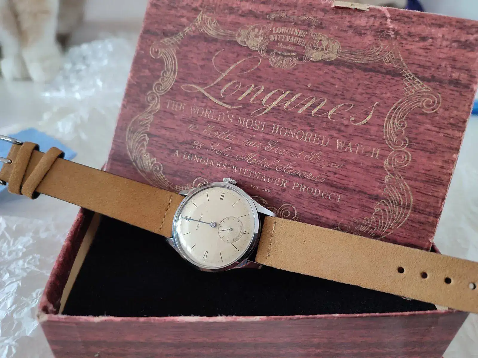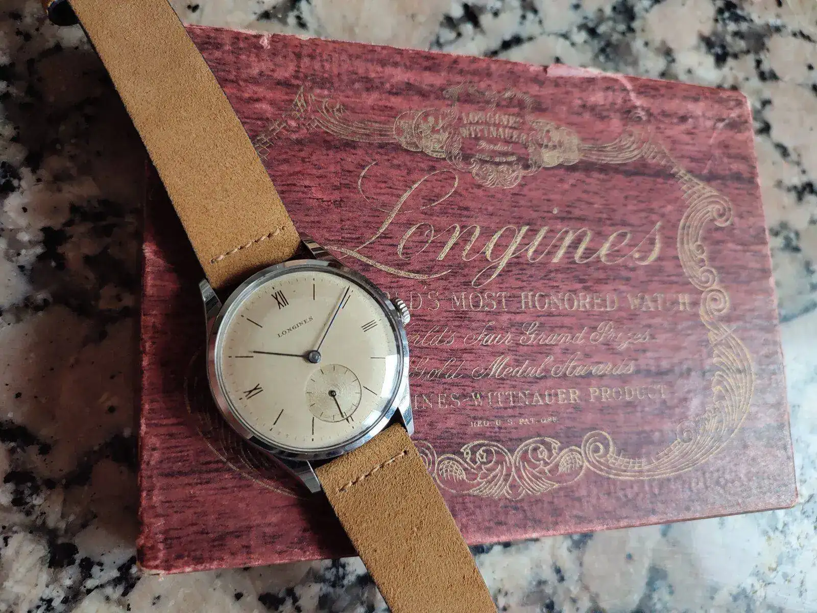 Esto es! Un Longines de los 40's que al tocarlo es una pasada! No se llega ha apreciar lo azul de las manecillas, la caja esta perfectamente bien (tengo relojes de 6 dÃas en peores condiciones) y una pátina muy loca! El cristal igual de bien. Imagino que algún remplazo llevará ya que son 80 tacos los que tiene, y tampoco soy de los que se ponen muy exquisitos en ese aspecto. Transmite los años que tiene y para mi eso es lo importante.