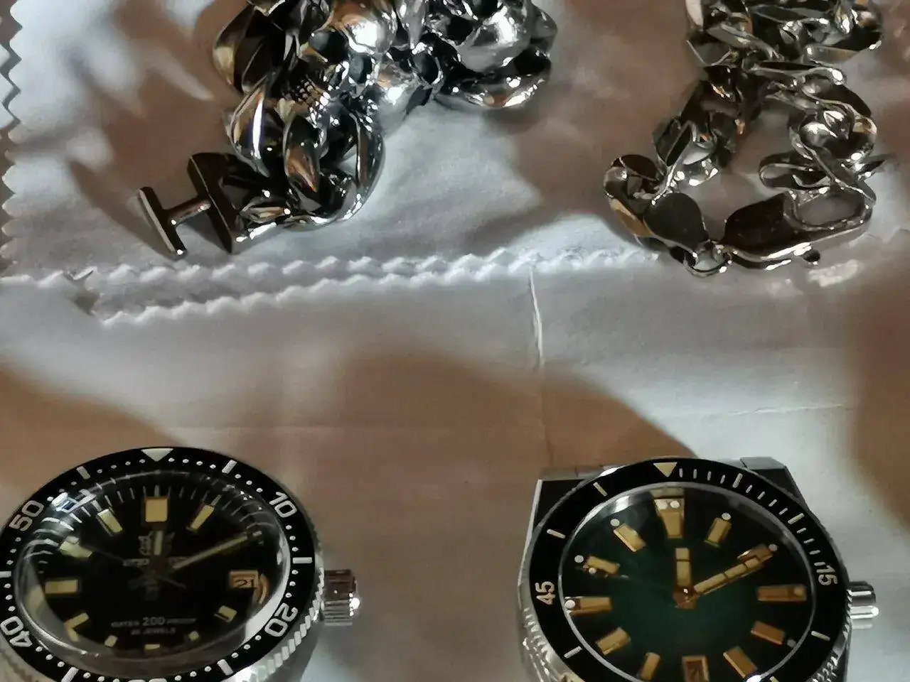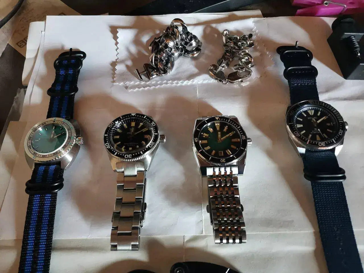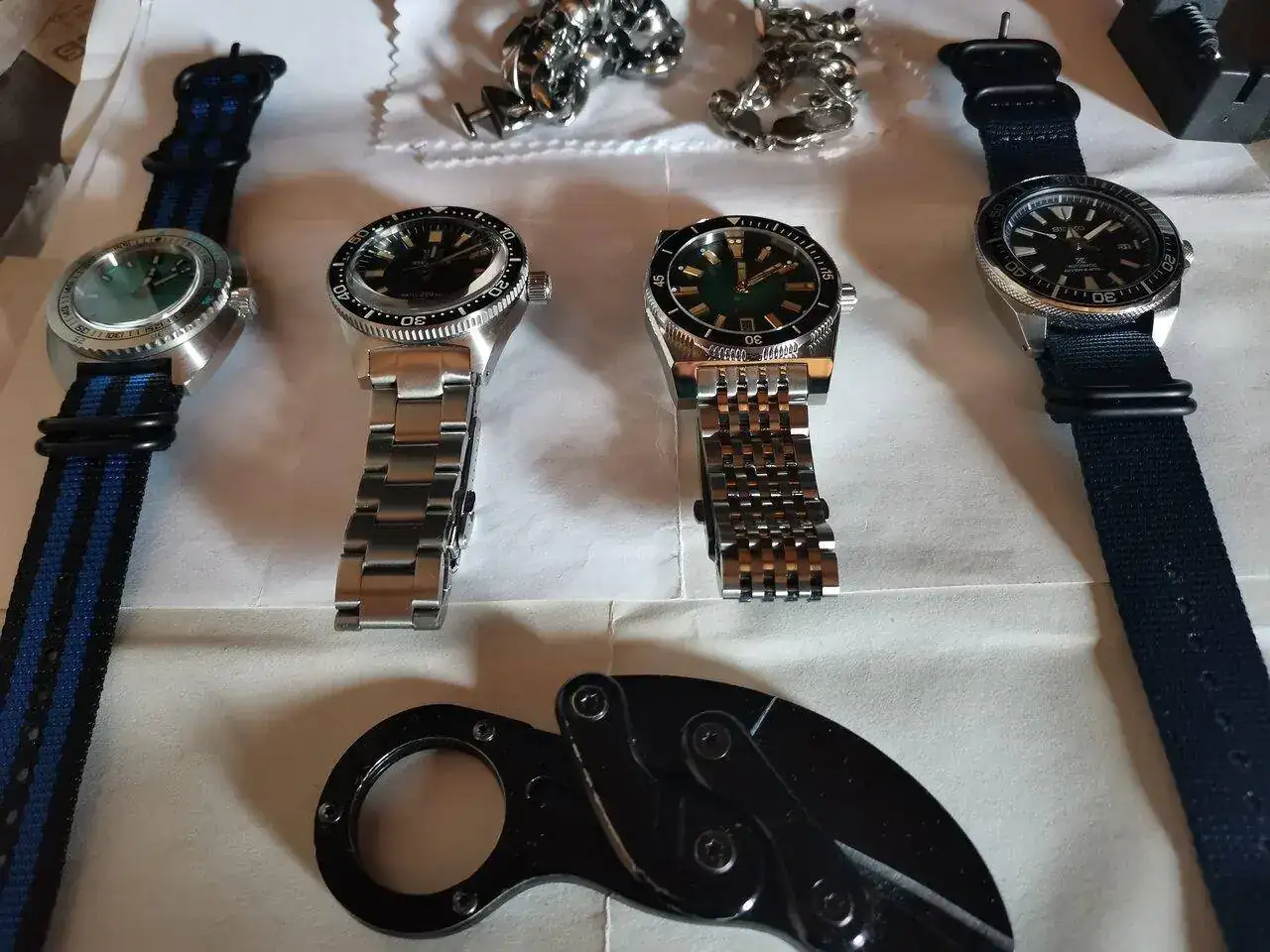 La fiebre relojera desde el 2008 hasta 2014 fue muy alta, más de 40 relojes en mis cajones, todos automáticos. Luego solo me quedé con con dos Seiko nuevos comprados a dos mercantes de aquí, un Samurai II dial azul y un Tortuga II dial negro aguas en dorado índices bisel etc. Hace poco no pude esperar para una caza mayor y para pasar el mono compre unos chinos con calibre Seiko NH35, Pagani azul homenaje al Doxa y un Steeldive 62mas homenaje al Seiko, este último es el que mejor ajustado esta de todos +1sg x 24h incredible lo bien que marcha y la calidad precio es alucinante. Ayer me llegó el PHOIBOS Narwhal dial verde calibre Miyota 9015, tuve un 30% en su página oficial Europa, quería un reloj con ése calibre desde hace mucho tiempo, me gustó mucho el reloj y su precio con el descuento. En las fotos falta el Tortuga, lo tengo en el servicio de Seiko para ajustar el trinquete del bisel.