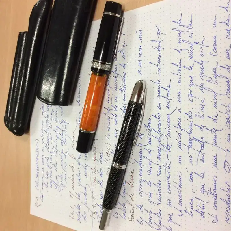 Mi experiencia con las plumas a sido casi nula, hasta la fecha y por cuestiones prácticas, solo uso boligrafos. No me hacía a la idea tener que poner y quitar el capuchón y por lo tanto aunque me gustaban mucho y me atraía la idea de escribir con ellas, sabía que no sería de uso habitual. Por casualidades de la vida en una reunión de compañeros del foro de relojes, Valira me iluminó al enseñarme este modelo que por mi desconocimiento no sabía que existía. Mi sorpresa fue inmediata y daba solución a todas las desventajas que veía en las plumas clasicas. Así pues no quedaba otra que dar rienda suelta a la ansiada ilusión de comenzar en este mundo que ya me da miedo como acabará.