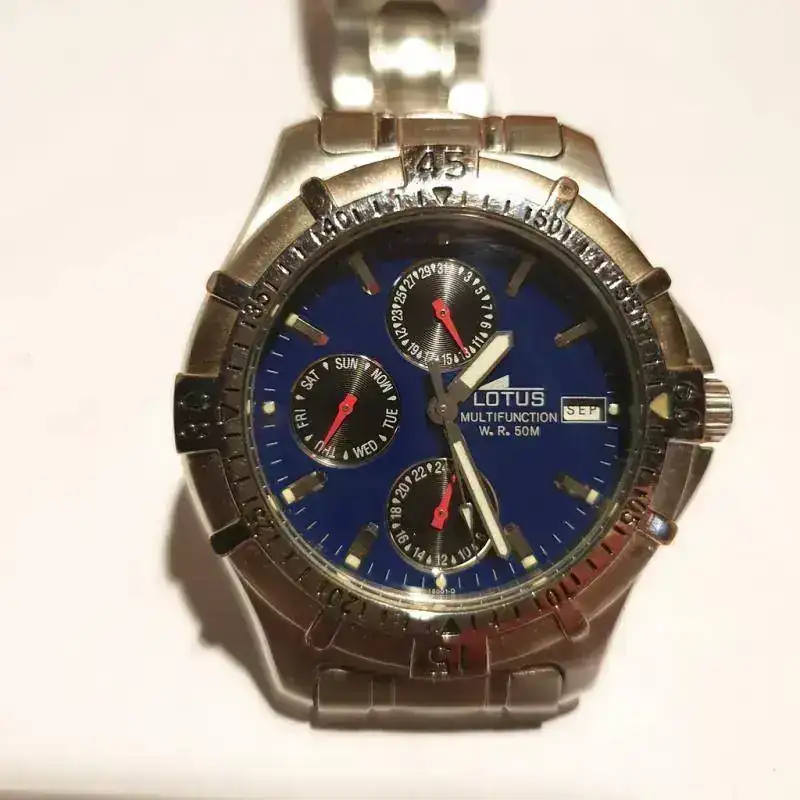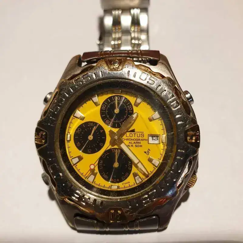 No recuerdo si entre el Formula 1 y este Lotus hubo alguno, pues pasaron 10 años entre ambos. Aunque me consta que para muchos Lotus es una marca "a despreciar" o, como he leído por aquí, una pulsera que da la hora, yo no solo tengo en estima a este modelo concreto, que además de dar la hora es cronógrafo, temporizador, doble alarma, doble hora y calendario autoajustable mes a mes, sino a la propia marca. Lo compré el 21 de diciembre de 1999, y lo se porque, como con el resto, aún conservo la caja original y garantía sellada. Este reloj lo he estado usando para todo hasta hace muy poco tiempo. Ha visto lluvia, piscina, playa, tierra.....y sigue funcionando con una precisión envidiable. Se trata de un Lotus Quartz Multichronograph, y aunque tras 20 años tiene sus más que evidentes marcas de uso, con pérdida del recubrimiento de la caja y el dorado del armis, creo que merece mucho más que el calificativo de "pulsera que da la hora".