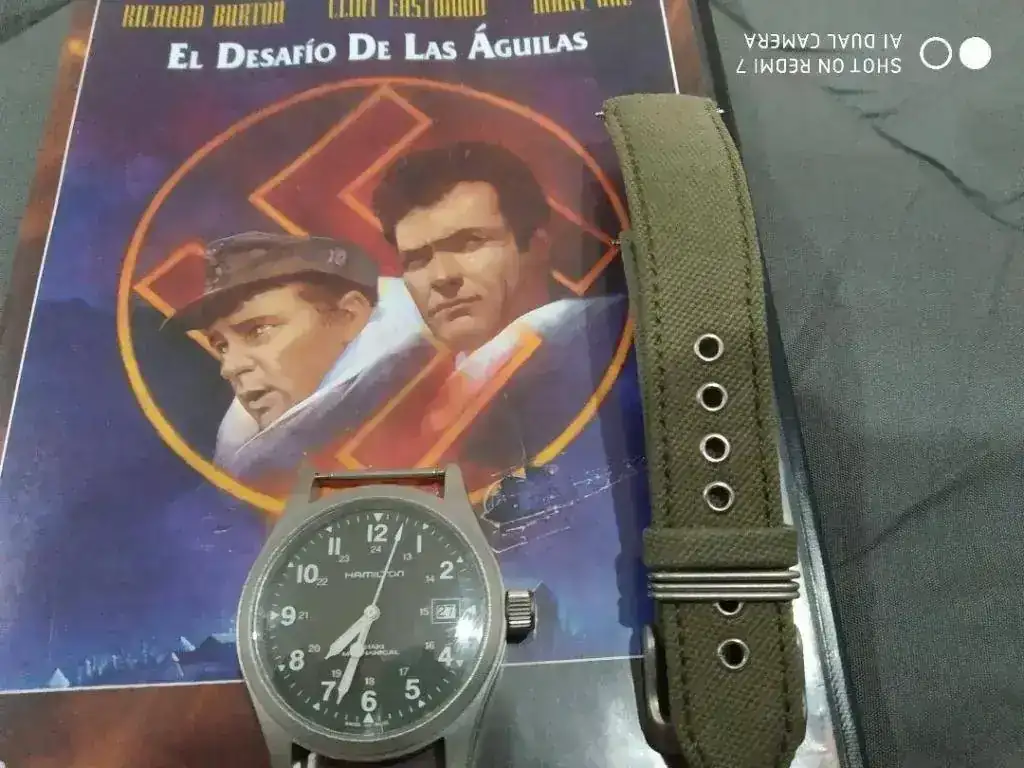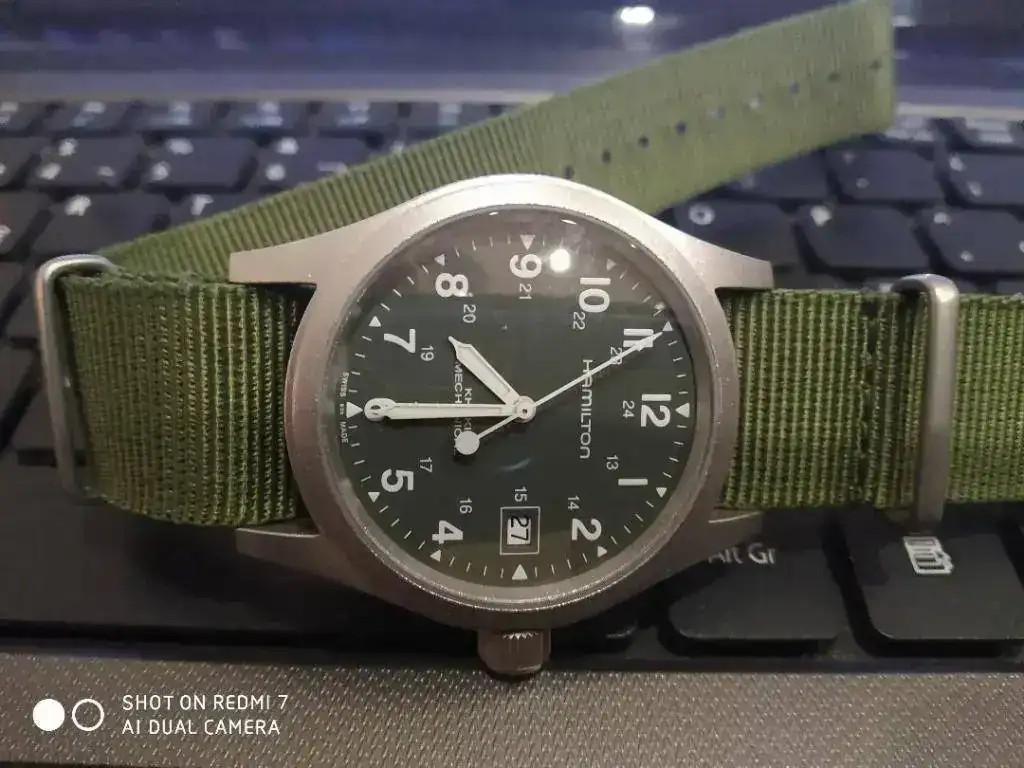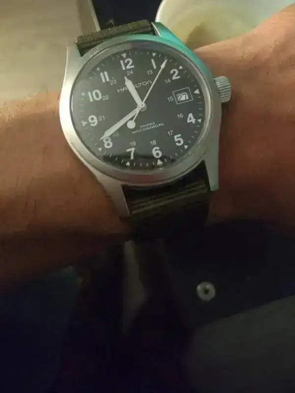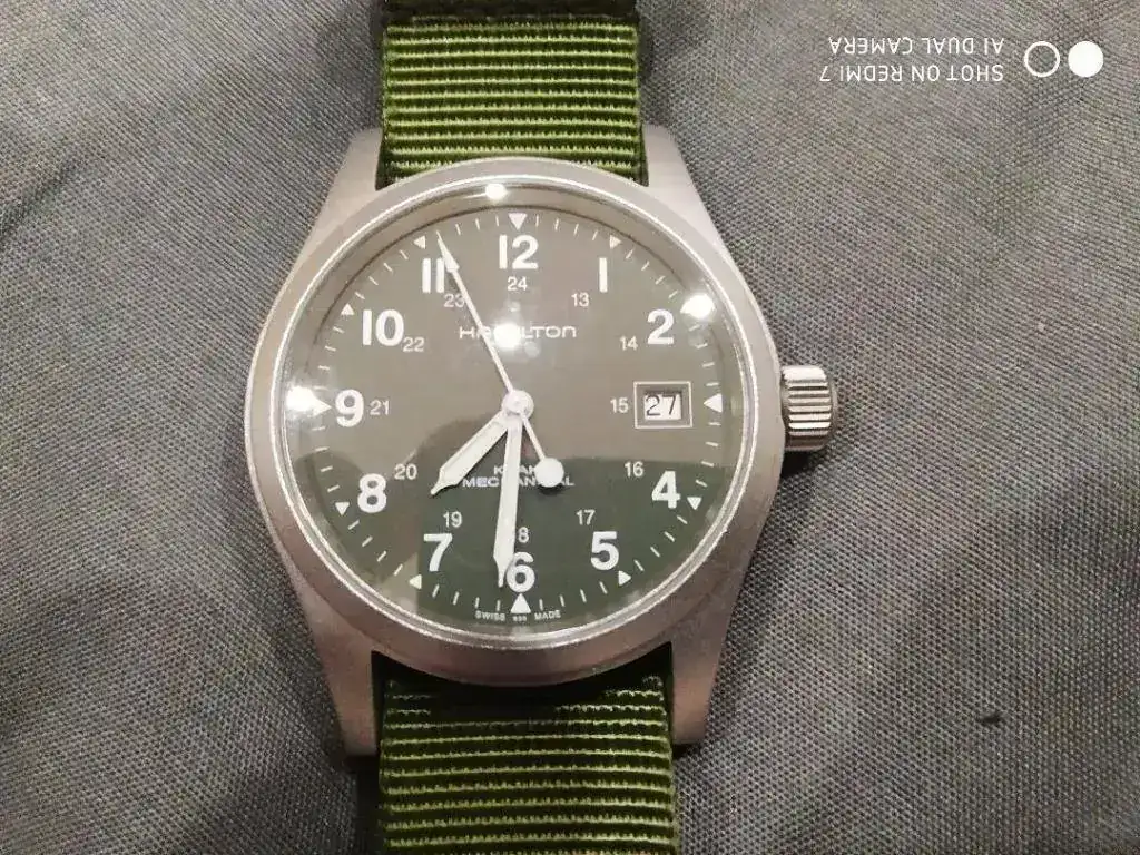 Ayer me llego este pequeño gran reloj de 38mm,muy cómodo muy legible,con una caja mate que me ha gustado mucho,y con esa enorme versatilidad a la hora de ponerle todas las correas que quieras que tienen estos hamilton khaki.Este reloj es nuevo,pero es el modelo con calibre h-10,de momento lo normal +12 al dia,pero ahora ya no miro tanto la precisión,me gusta más la sensación que te da un reloj mecánico,en esta era que todo es mega electrogeno y virtual.