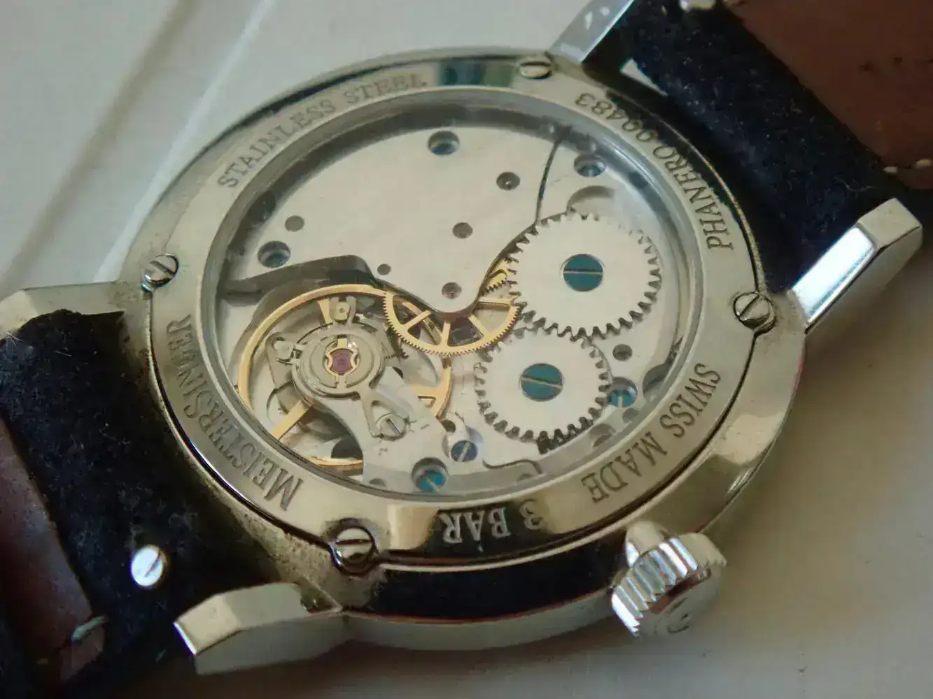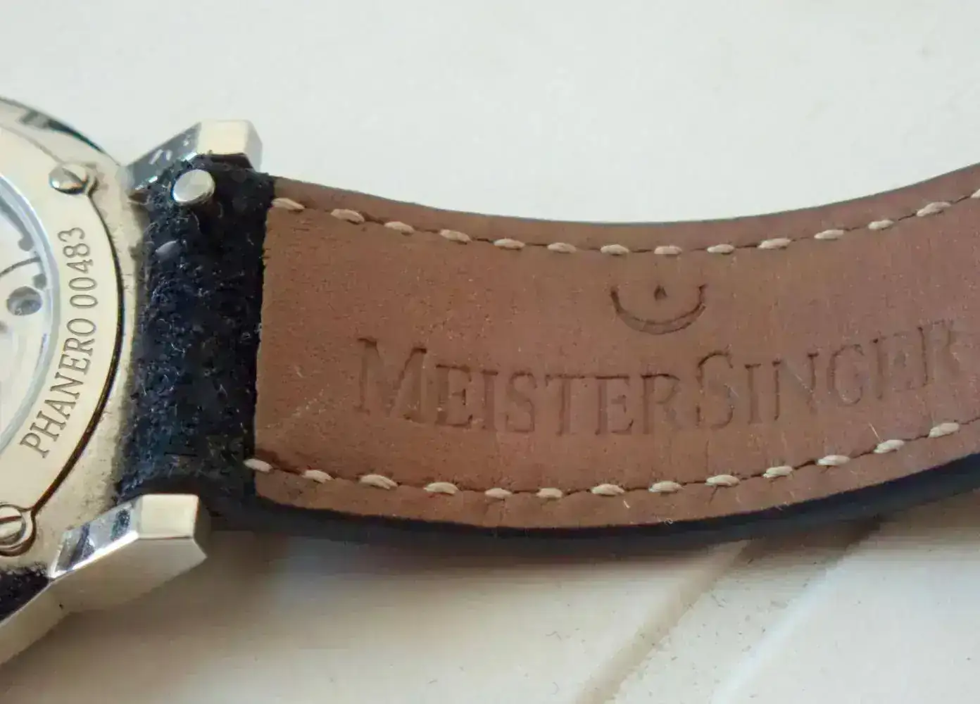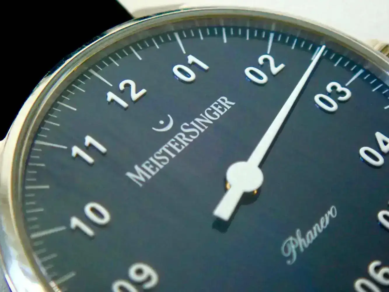 El curioso dial y tan típico de Meistersinger con sus "ceros" y esa aguja casi de juguete, casi como si estuviera dibujada.