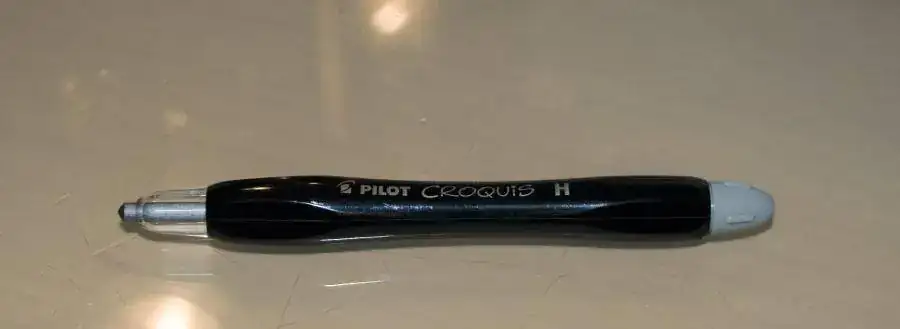 Se trata de un portaminas grueso, más más bien muy G-R-U-E-S-O, obscenamente grueso, de 18 mm de diámetro. Esta es una de las objeciones que se le pone a veces, su casi inmanejabilidad. Yo discrepo, su grosor es lo que hace que se tenga que asir ampliamente, lo que facilita el gesto de trazar las líneas al dibujar.