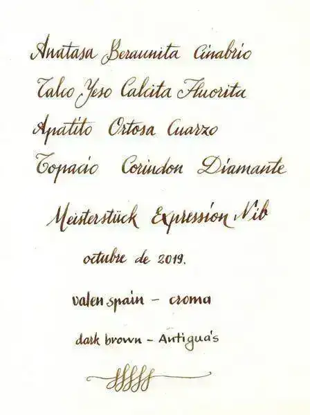 Aportamos como ejemplo una prueba de escritura, hecha por alguien no especialmente diestro en este sentido, pero que ayuda a visualizar lo expuesto hasta ahora. La tinta utilizada es Dark Brown de Antigua’s (un saludo a Miguel Ángel) y se han utilizado papeles Parchemin de Galgo (Papelera Tolosana, de bodega) y Opale Reference Liso (de Arjo Wiggins).