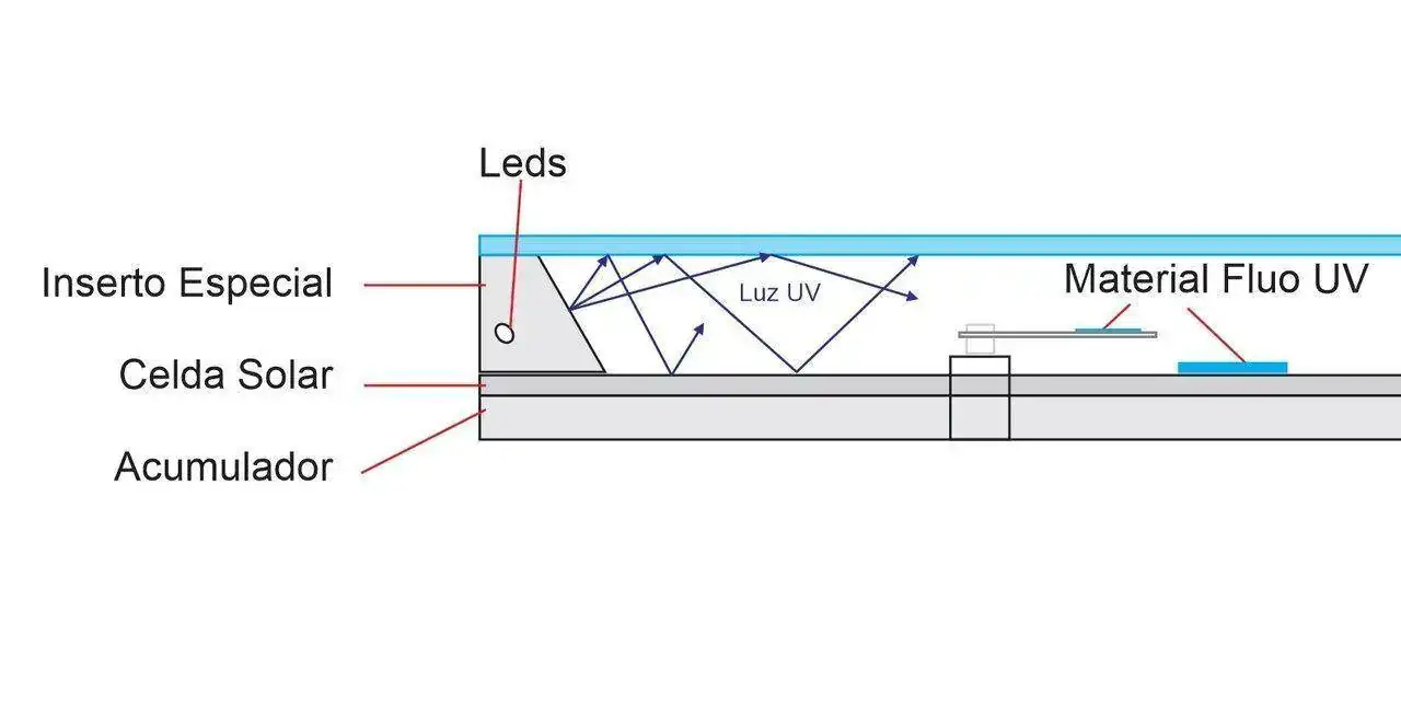 Es que ya eliminé la batería y la celda solar. :😊:Tienes LEDs excitables por UV que se usan para fluorescencia. Pero entonces, el que no entiende soy yo: ¿células solares que alimentan un condensador/batería que alimenta LEDs UV que alimentan alguna sustancia fluorescente?