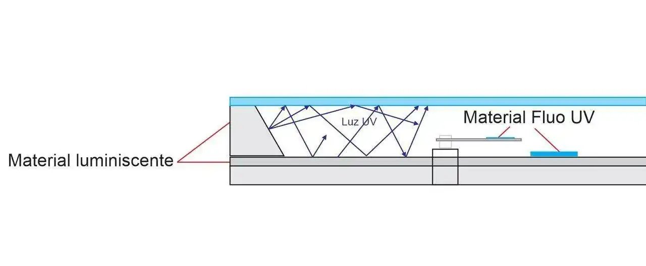 - Este material emite luz UV. El cristal sirve de espejo, por el ángulo o por tener un recubrimiento reflex e ilumina el material fluorescente que está "pintado" sobre marcadores y agujas.