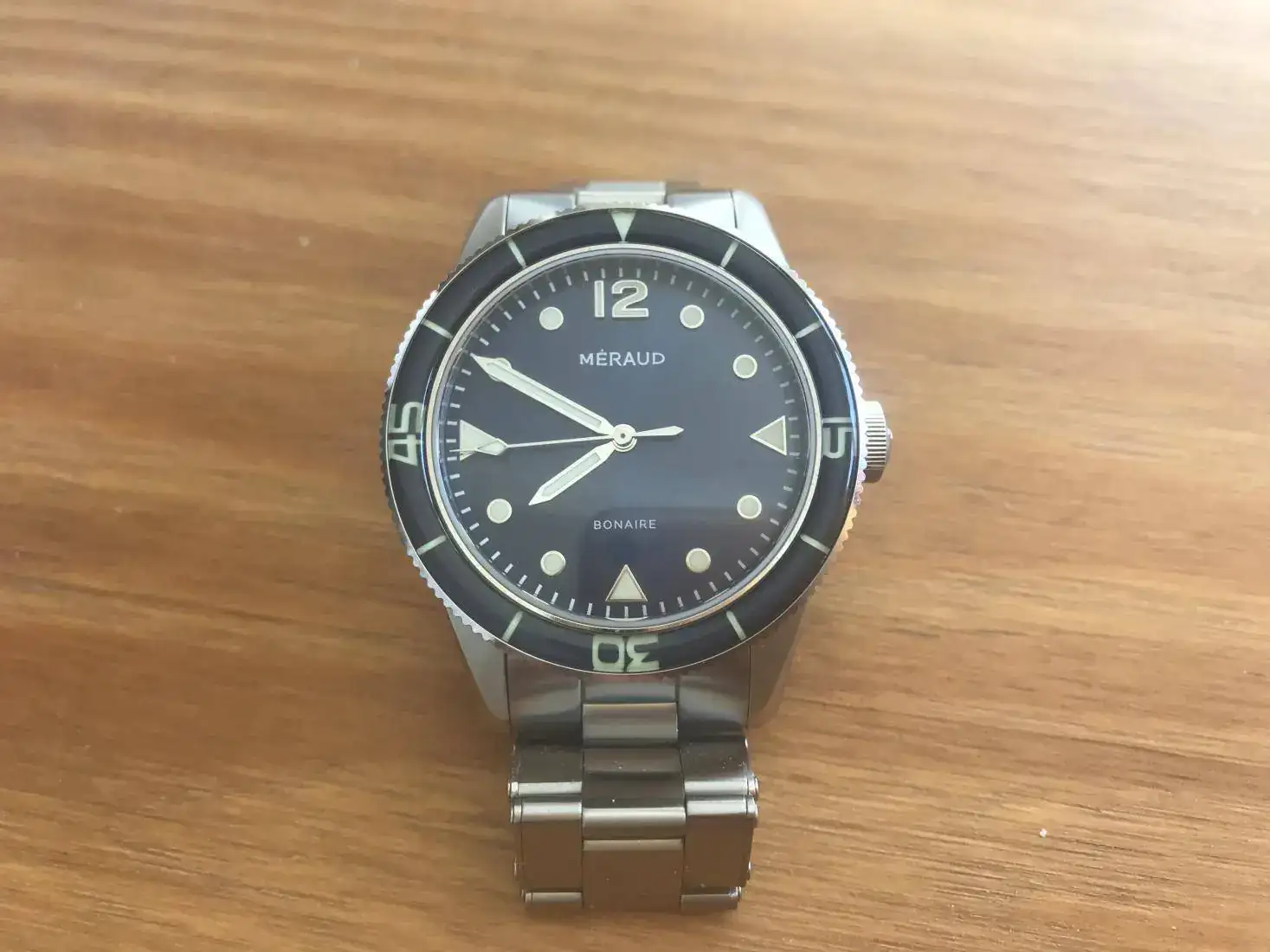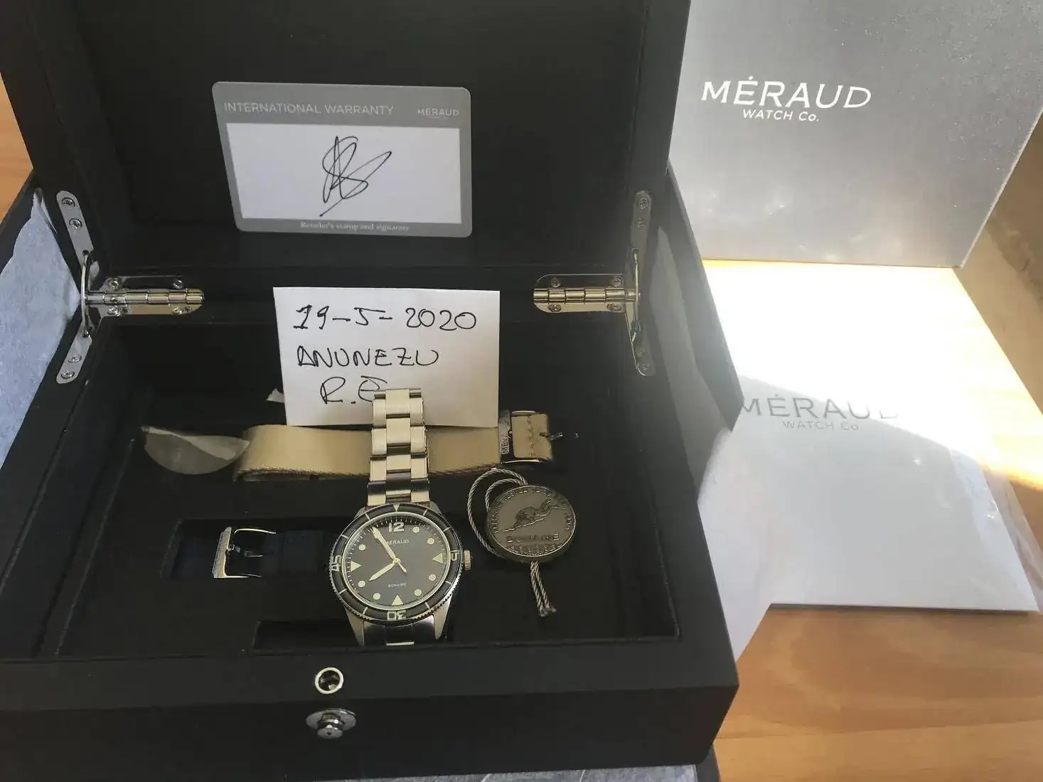 La dotación se compone de :caja,instrucciones,tarjeta de garantía en vigor,armis firmado Meraud,caucho azul Meraud y nato beige Meraud.