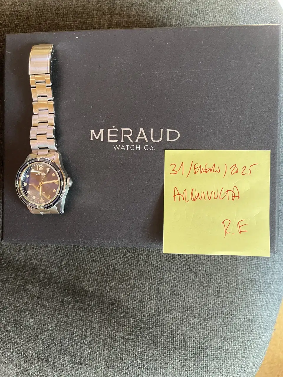 Se trata de una pieza de la marca belga Meraud, el Bonaire "Marine Blue" (desde mi punto de vista la esfera más bonita(. Porta un calibre denominado UP G-101, movimiento automático suizo producido en La Chaux-de-Fonds, que opera a 28,800 alternancias por hora y cuenta con 68 horas de reserva de marcha.